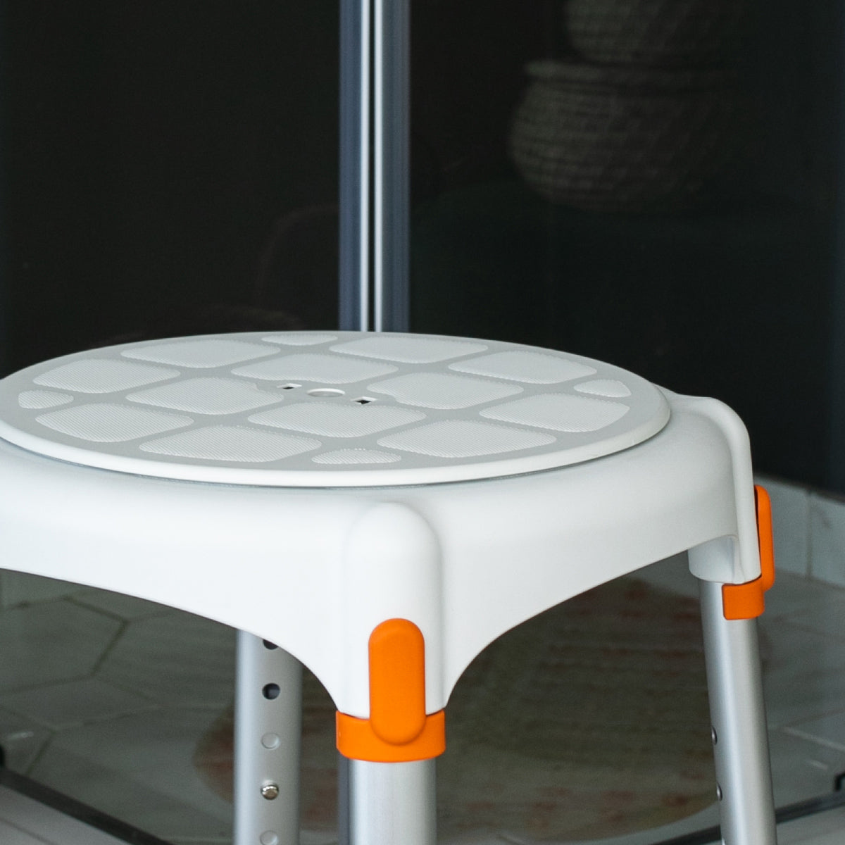Hækkanlegur baðkollur með snúningssessu. Auðveldar aðgengi og athafnir við sturtu eða snyrtingu. Sessan er stöm sem kemur í veg fyrir að renna á blautu yfirborði. Bakki undir eykur stöðugleika og þar er hægt að geyma snyrtivörur. Hæð 39-54,5 cm frá gólfi.