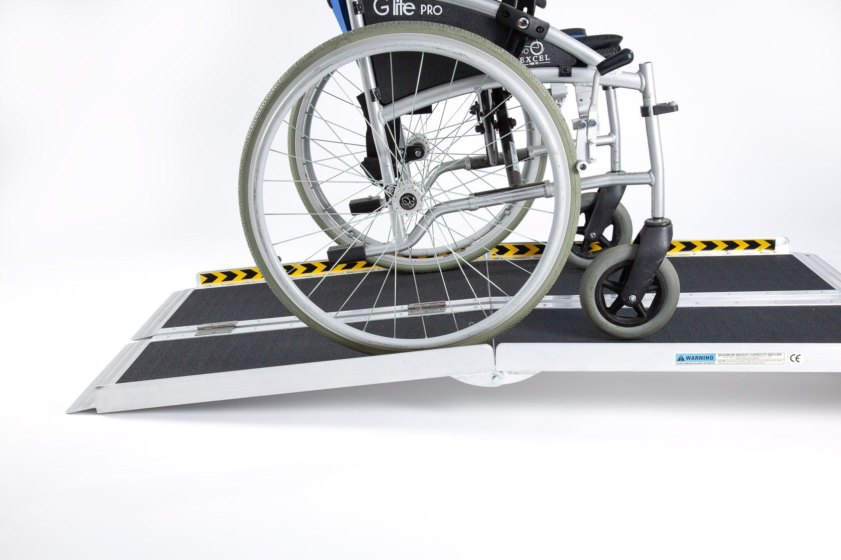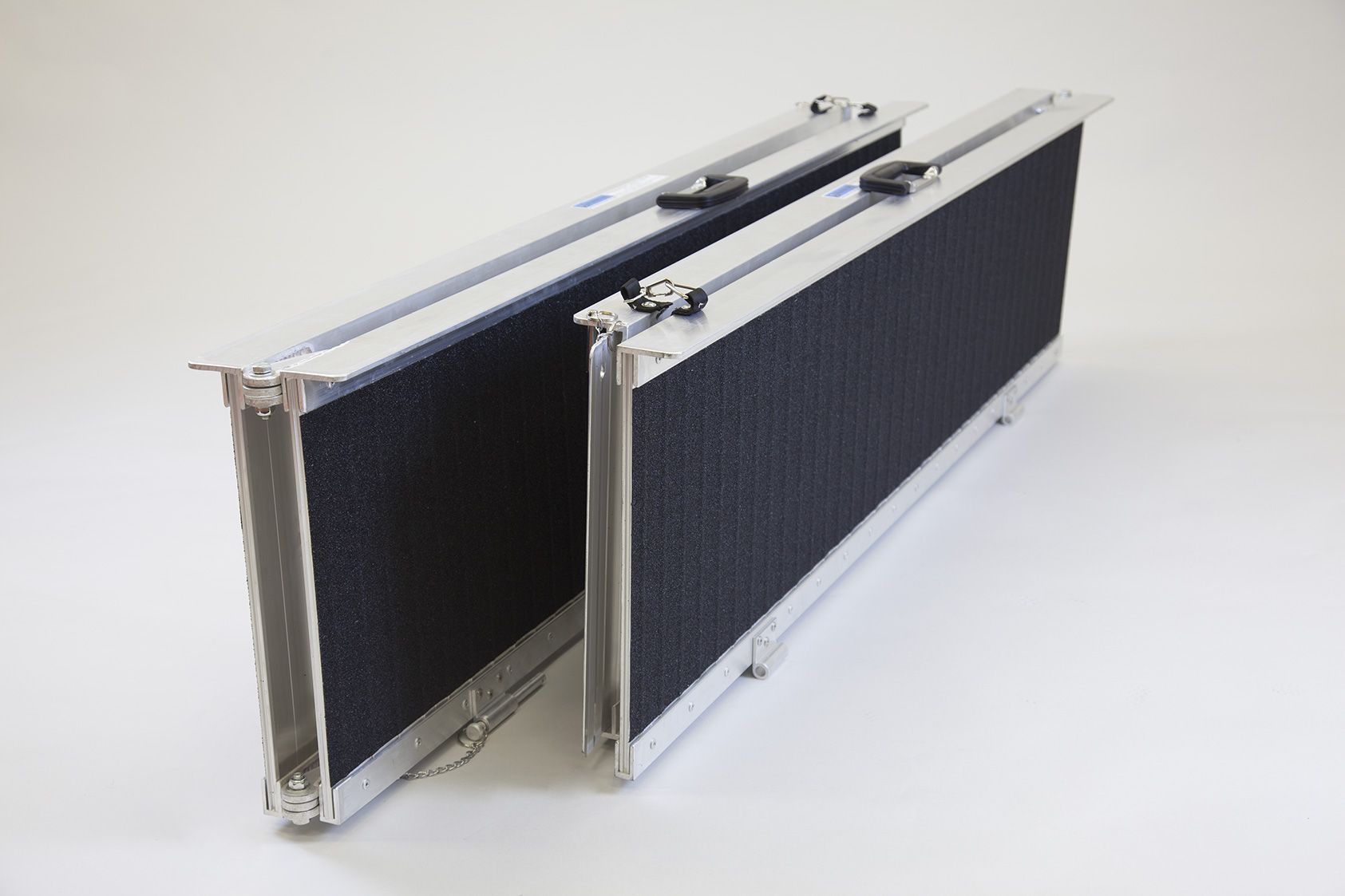 Split Multifold Ramp, samanbrjótalegur hjólastólarampur með svörtu grip yfirborði. Rampurinn er meðfæranlegur og auðveldur í uppsetningu.