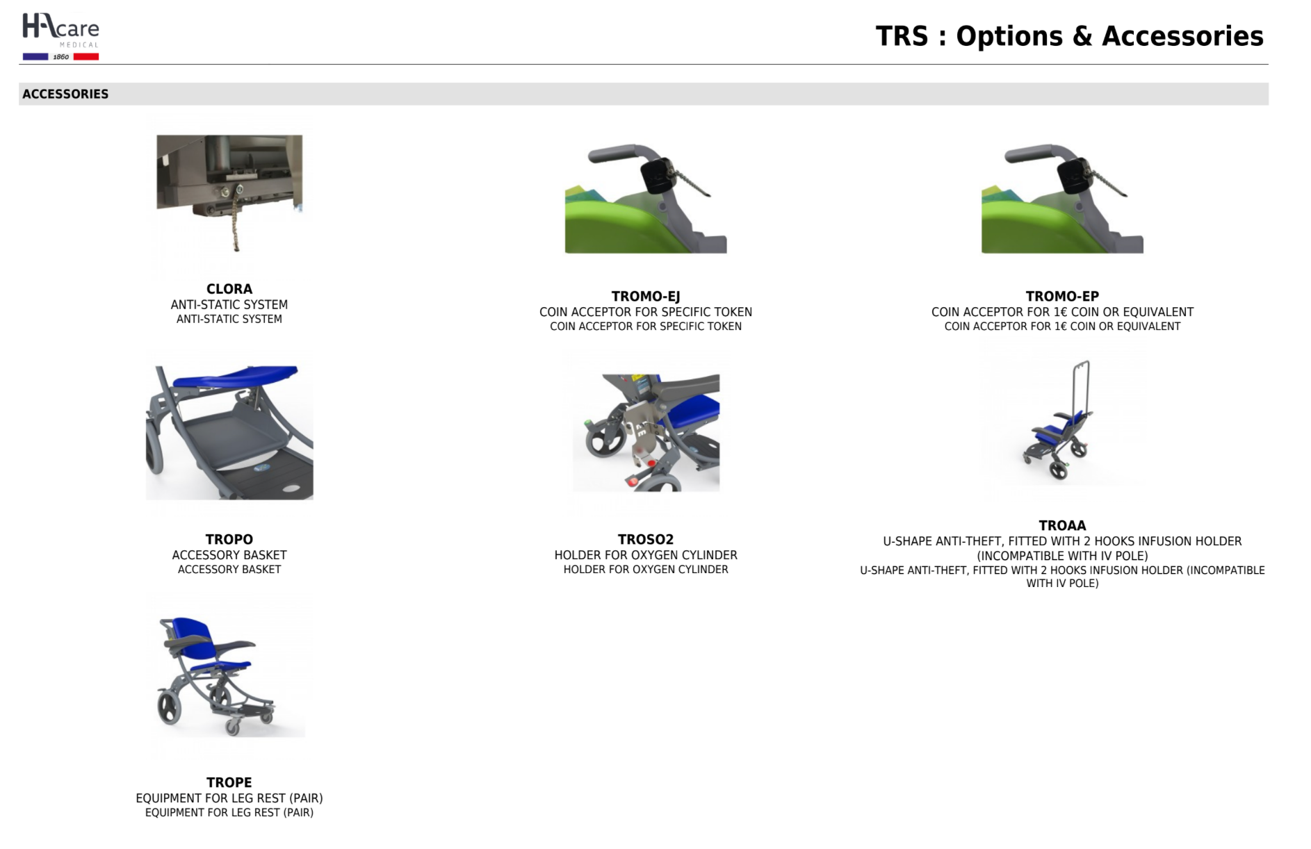 Hægt er að fá ýmsan aukabúnað svo sem upphækkanlegar fótahvílur, körfu, festingu fyrir súrefniskút, IV stöng, þjófavörn og anti static system
