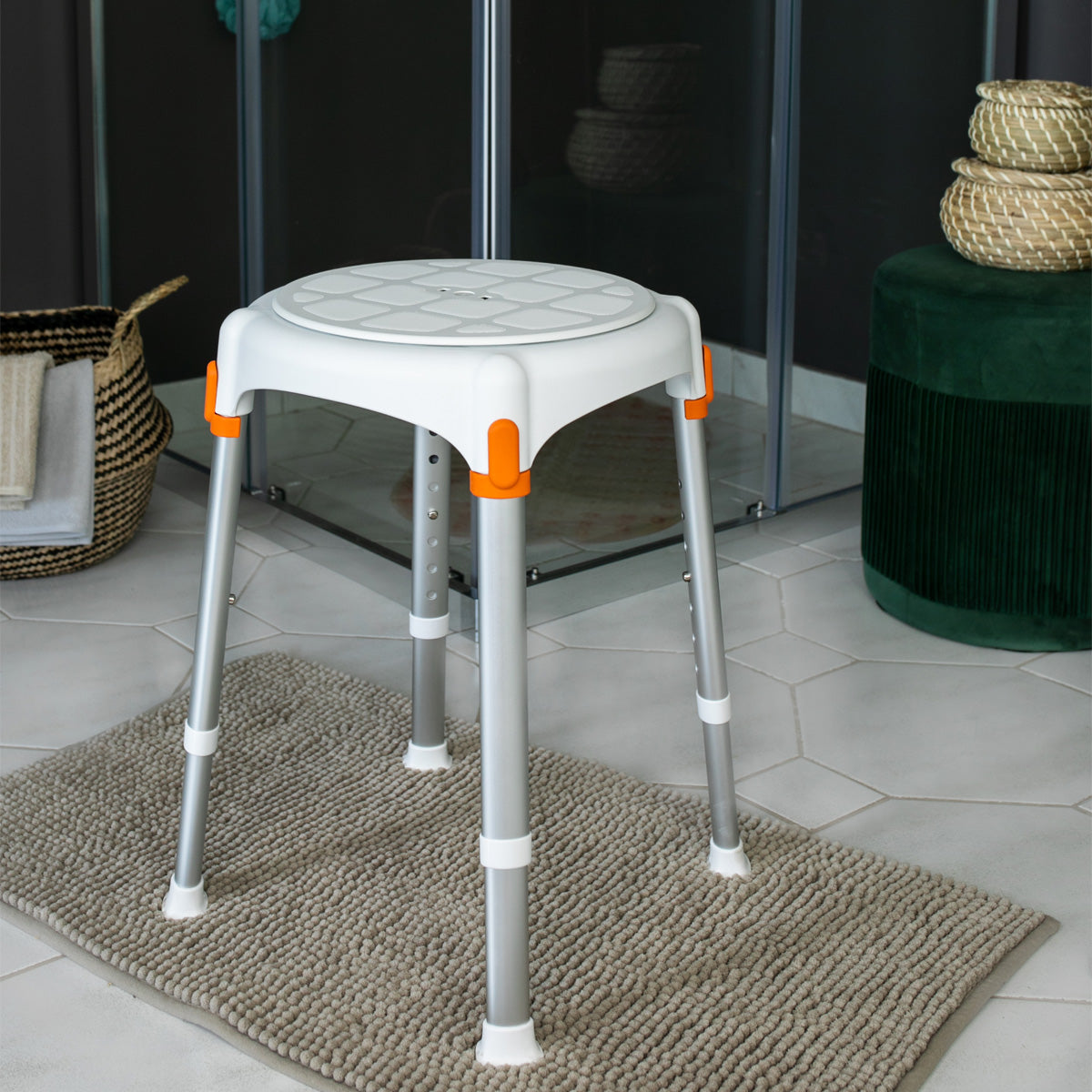 Hækkanlegur kringlóttur baðkollur sem eykur öryggi við sturtuferðir og snyrtingu. Ergónómísk seta með "Anti-slip" eiginleikum. Hæð er frá 39 til 54 cm frá gólfi. Vandaður, stílhreinn og handhægur í geymslu.