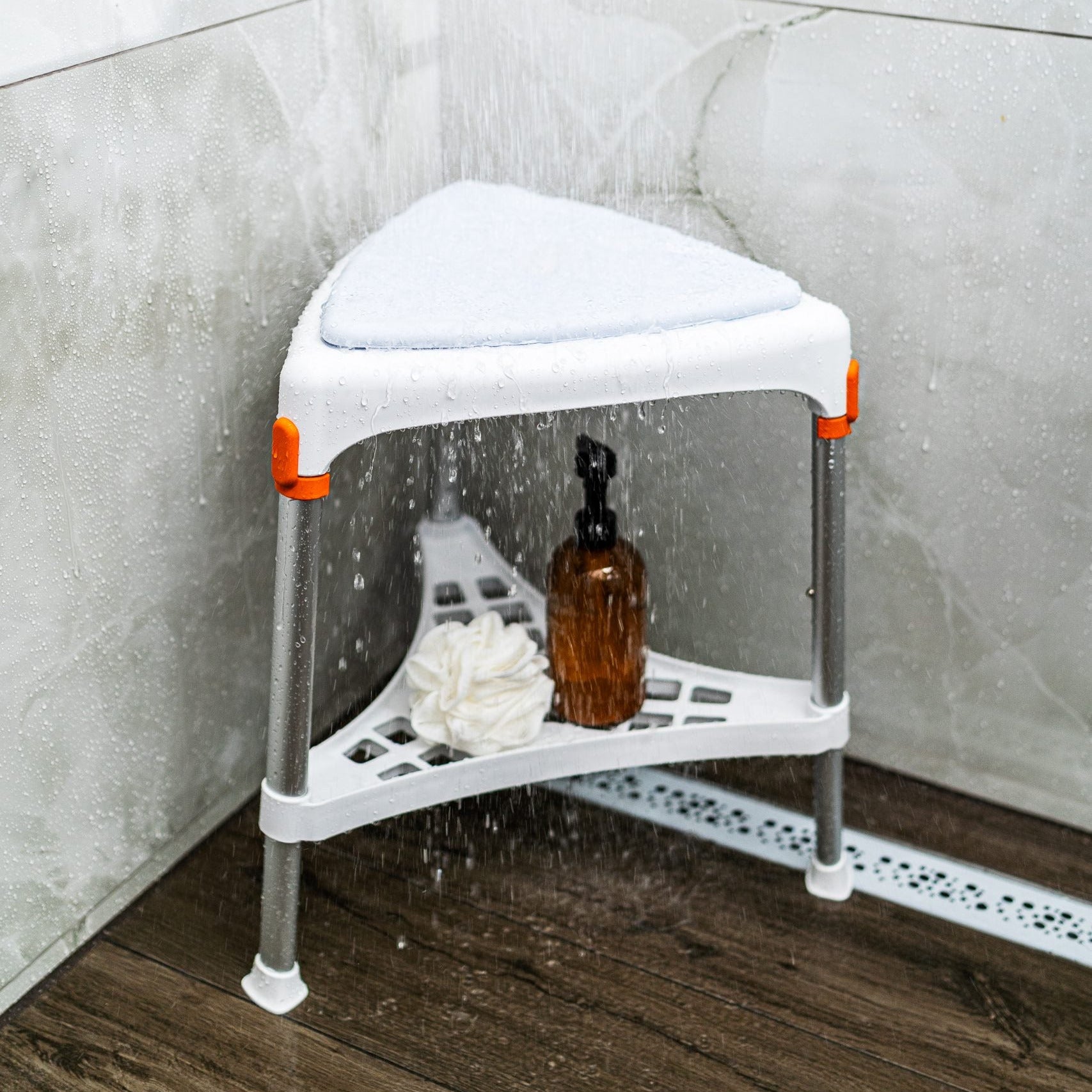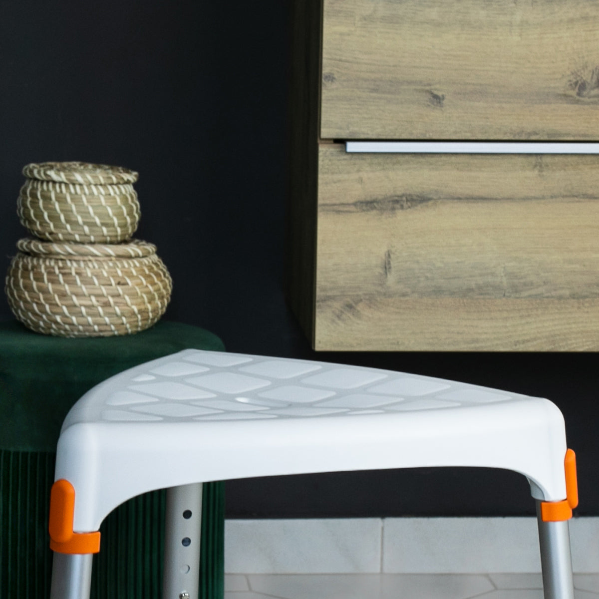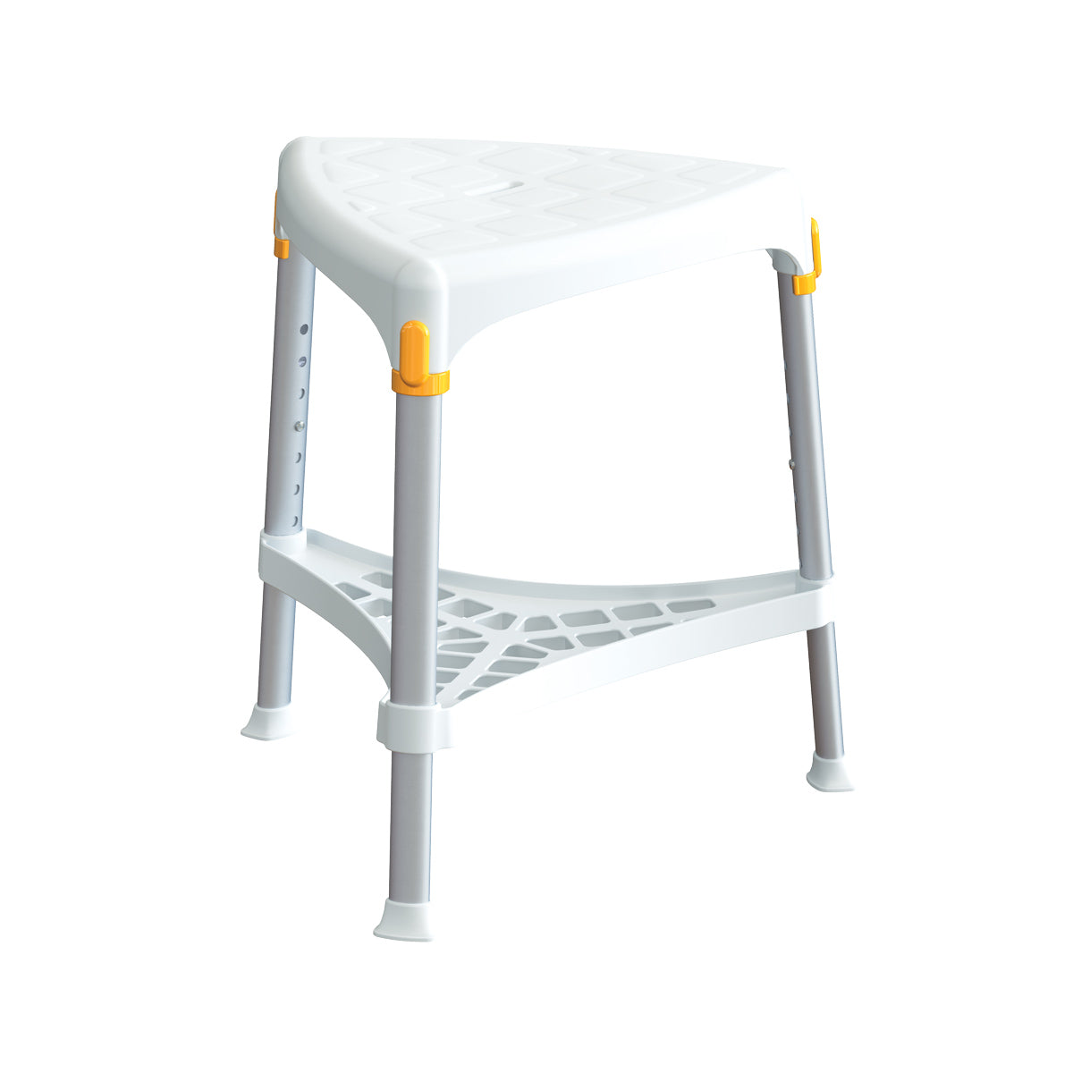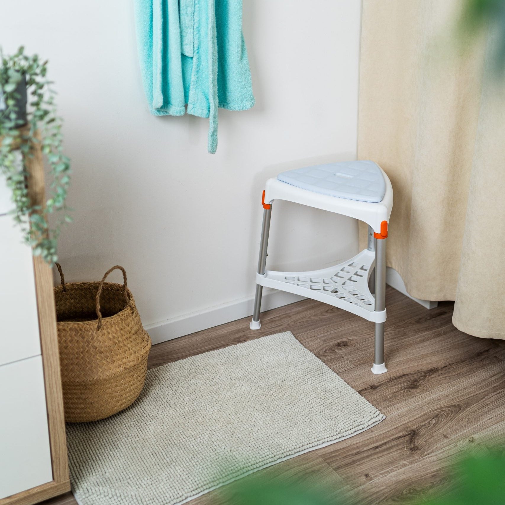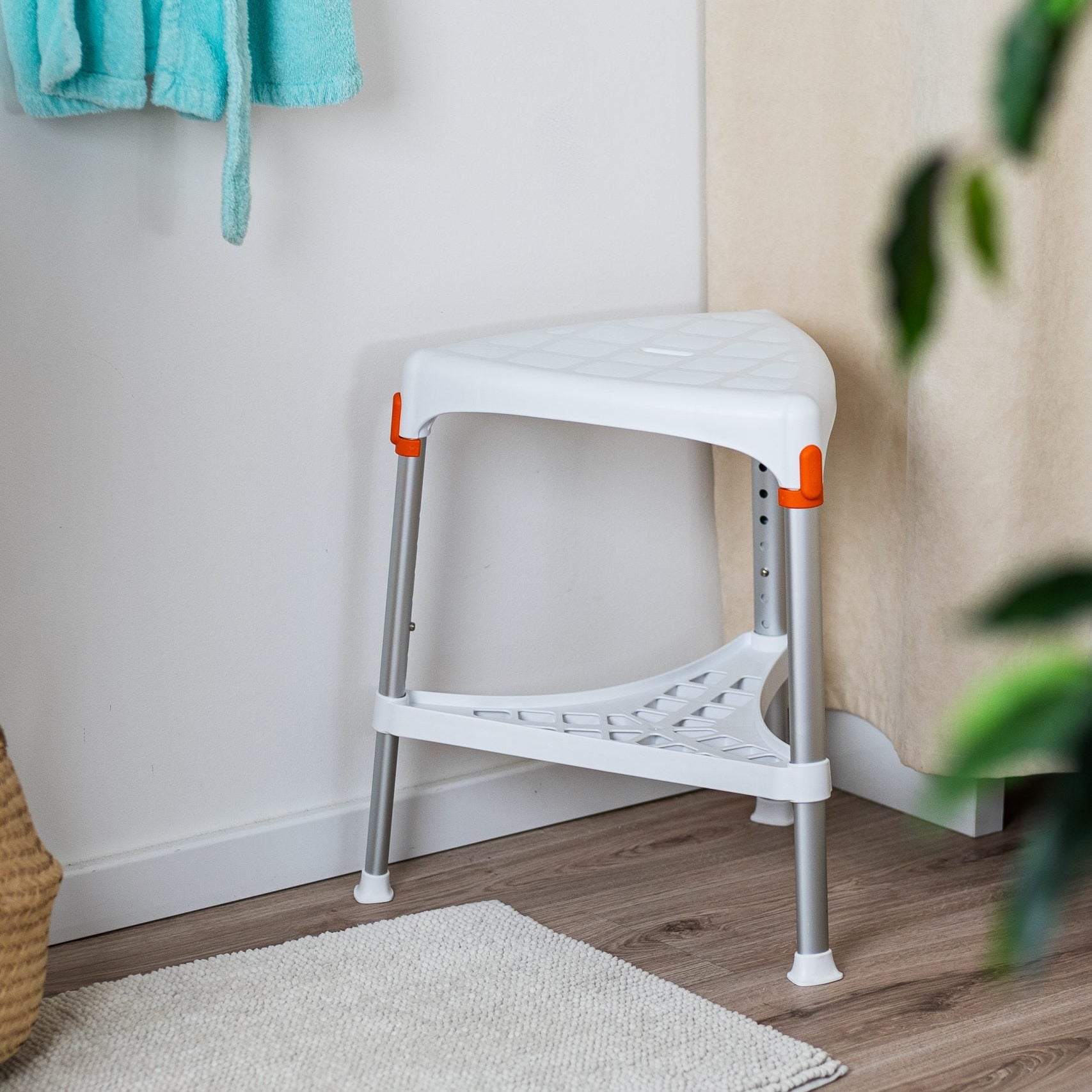 Hækkanlegur þríhyrndur baðkollur sem eykur öryggi við sturtuferðir og snyrtingu. Bakki undir eykur stöðugleika og þar er hægt að geyma snyrtivörur. Hæð er frá 39 til 54 cm frá gólfi. Vandaður, stílhreinn og handhægur í geymslu.