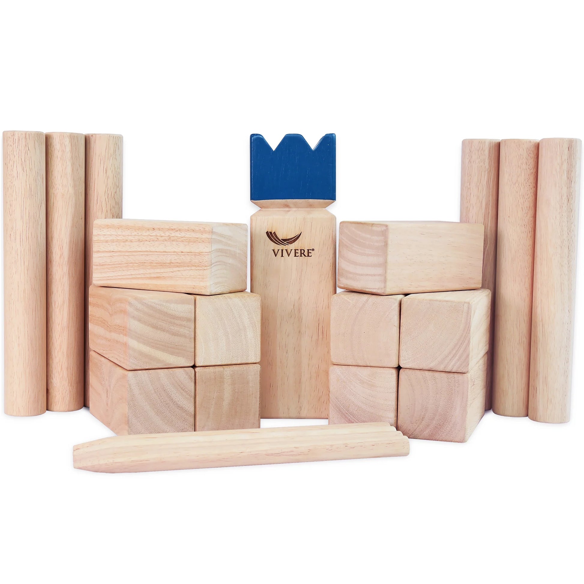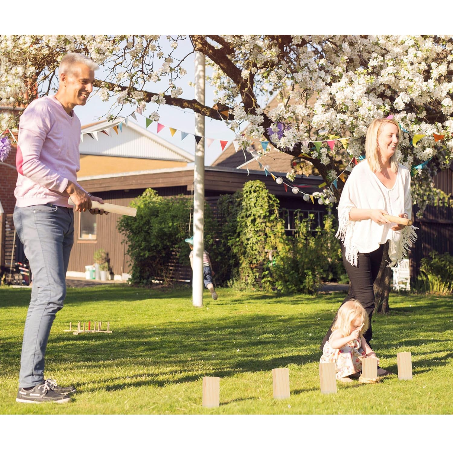 Sígilt útileikfang frá Vivere sem allir geta tekið þátt í. Þetta sett er hannað samkvæmt opinberum mótastöðlum. Kubbunum er raðað á afmarkað svæði í mismunandi fjarlægð frá kaststað. Leikið er í tveimur liðum sem keppast um að fella kubbana og loks kónginn með kastkeflunum. Frábær skemmtun í útilegu, garðveislu, ættarmót eða hvers kyns samkomu utandyra. Inniheldur vandaða og endingargóða kubba og kefli úr hægvaxandi FSC vottuðum gummívið sem er endingarbetri og þéttari en aðrar viðartegundir.