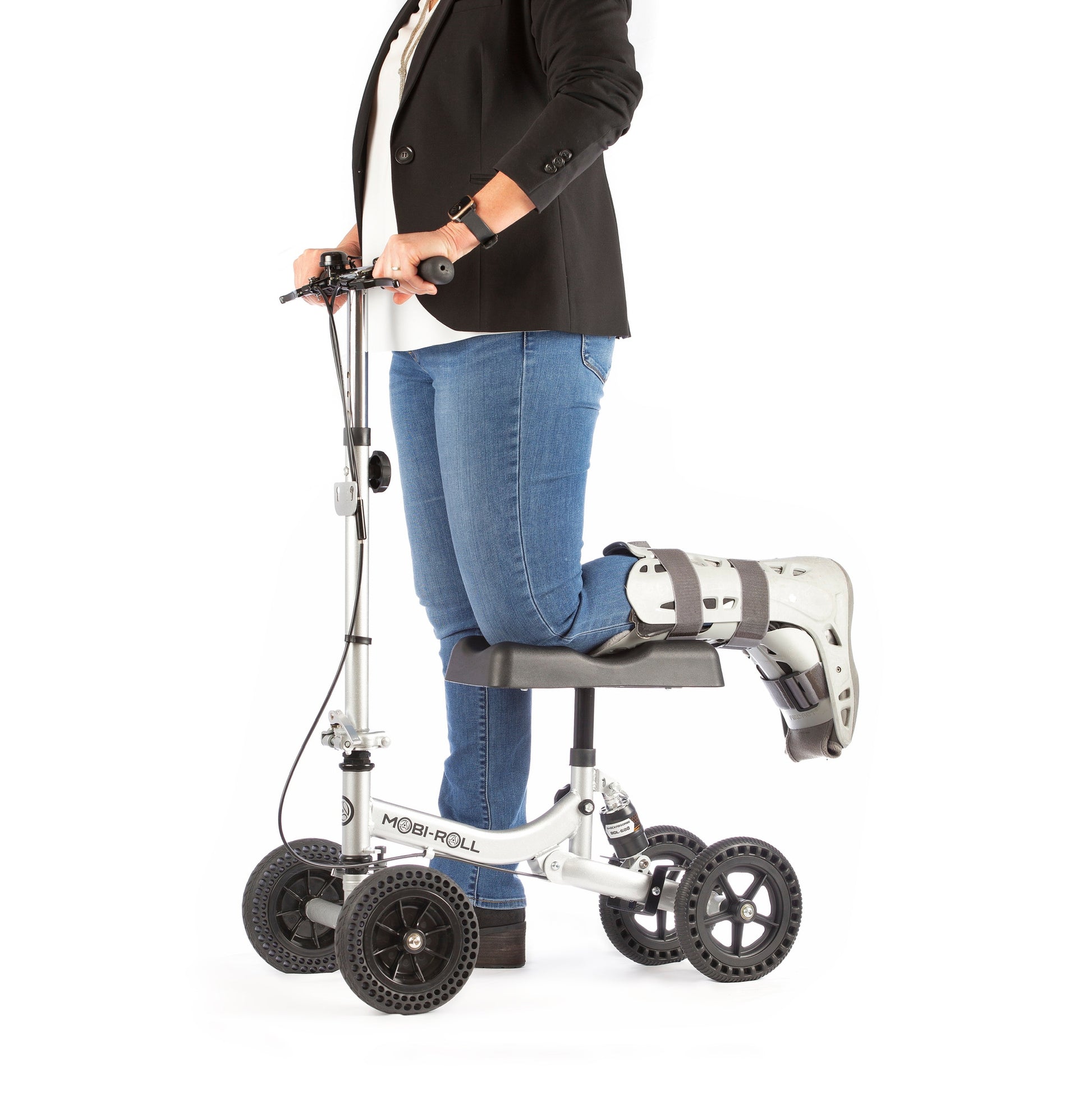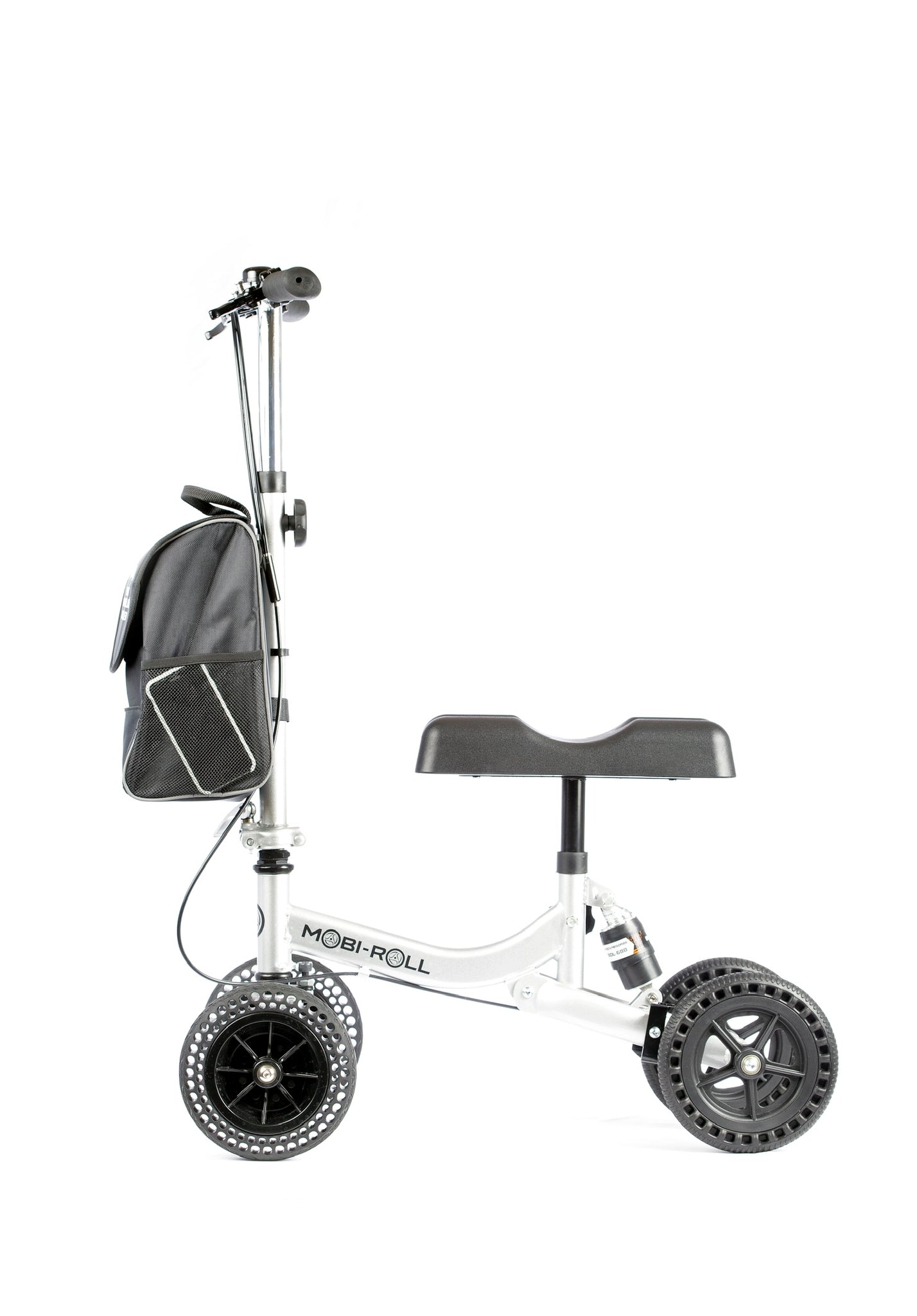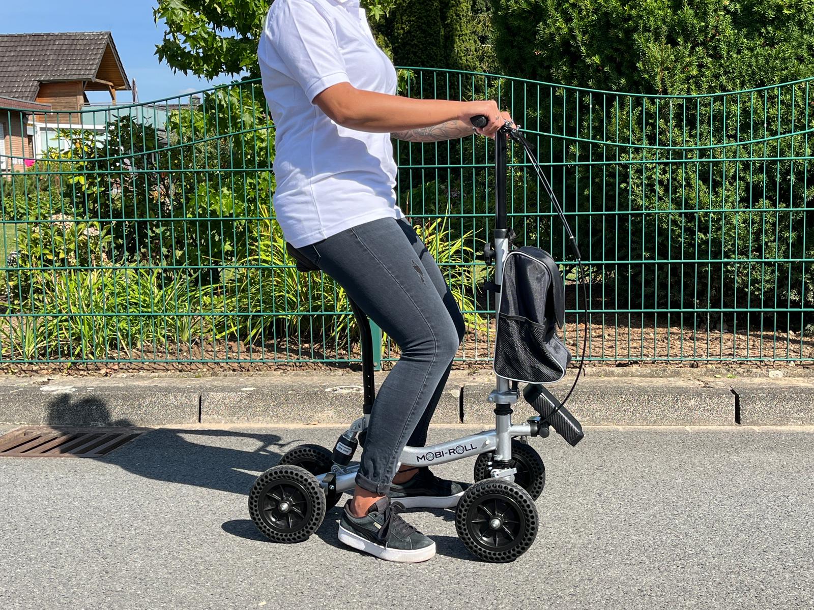 Hnéhjól er mjög hentugt í þeim tilfellum sem það eru meiðsli eða brot í fæti fyrir neðan hné. Hnéhjól getur komið í staðinn fyrir hækjur eða hjólastól og veitir mun betri möguleika á hreyfanleika. Mobi-Roll hnéhjólið getur þannig hjálpað þér að halda áfram að vinna dagleg verkefni. Hnéhjólið er með dempara sem eykur þægindi sérstaklega í útiveru. Mobil-Roll hnéhjólið kemur með tösku framan á stýrið svo þú getir geymt það nauðsynlegasta.