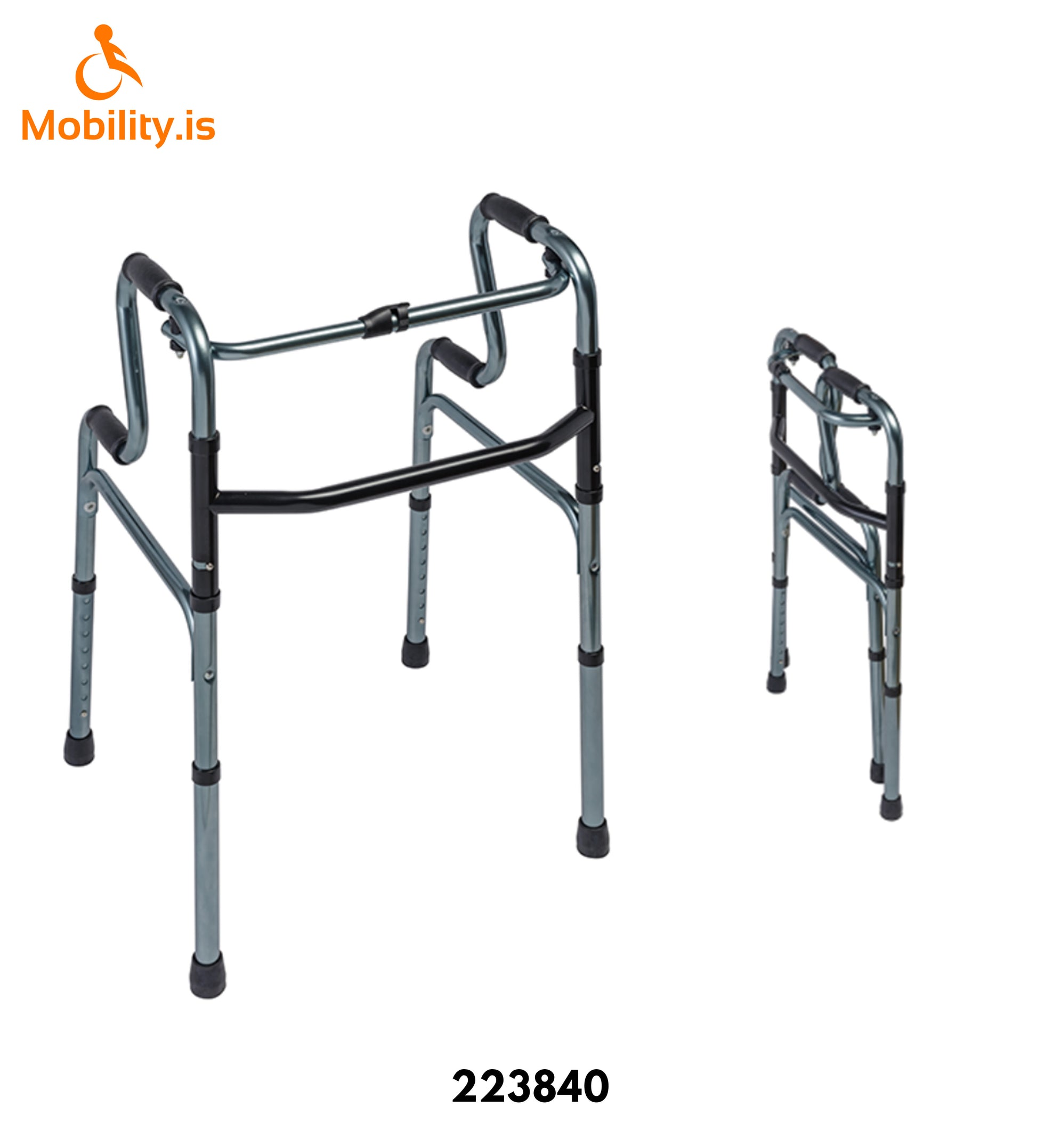 Stöðugur samanbrjótanlegur göngurammi með hæðarstillanlegum fótum. Samtals 4 handföng, 2 gönguhandföng og 2 handföng sem auðvelda notandanum að standa upp. Litur: Grár
