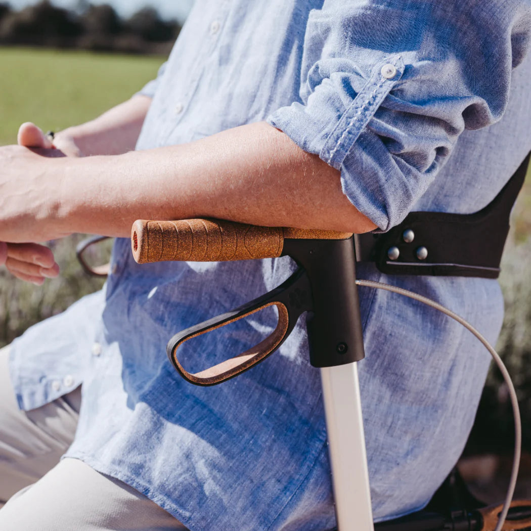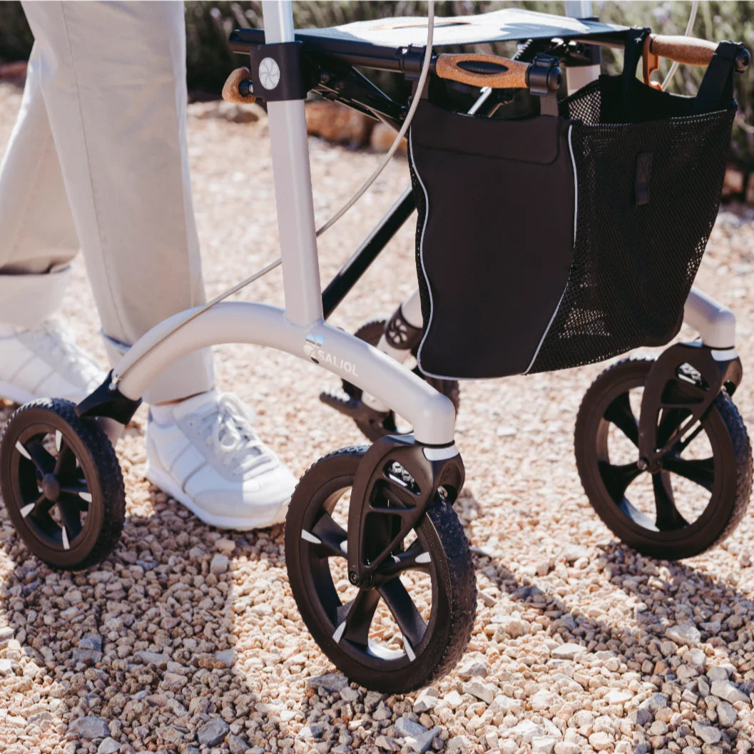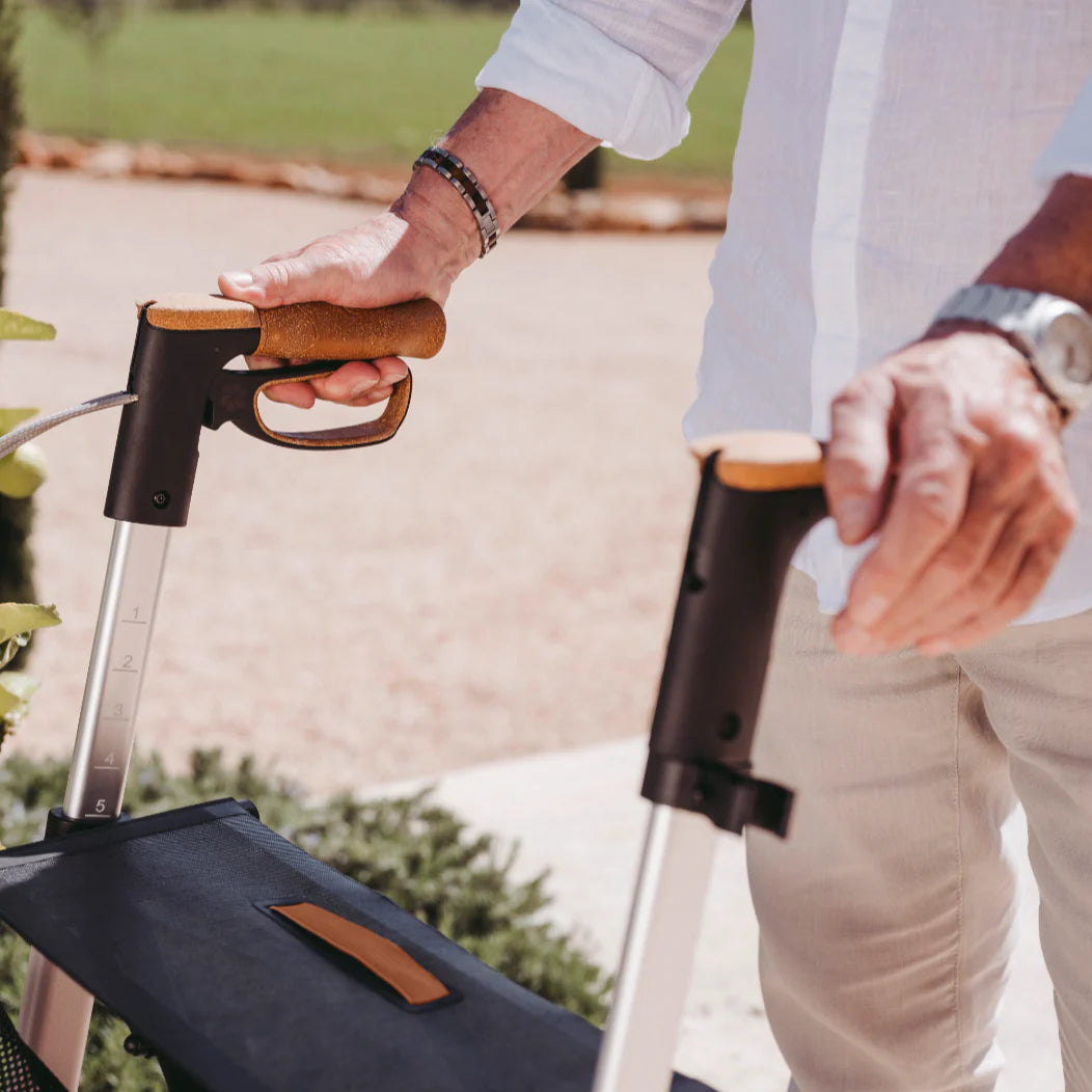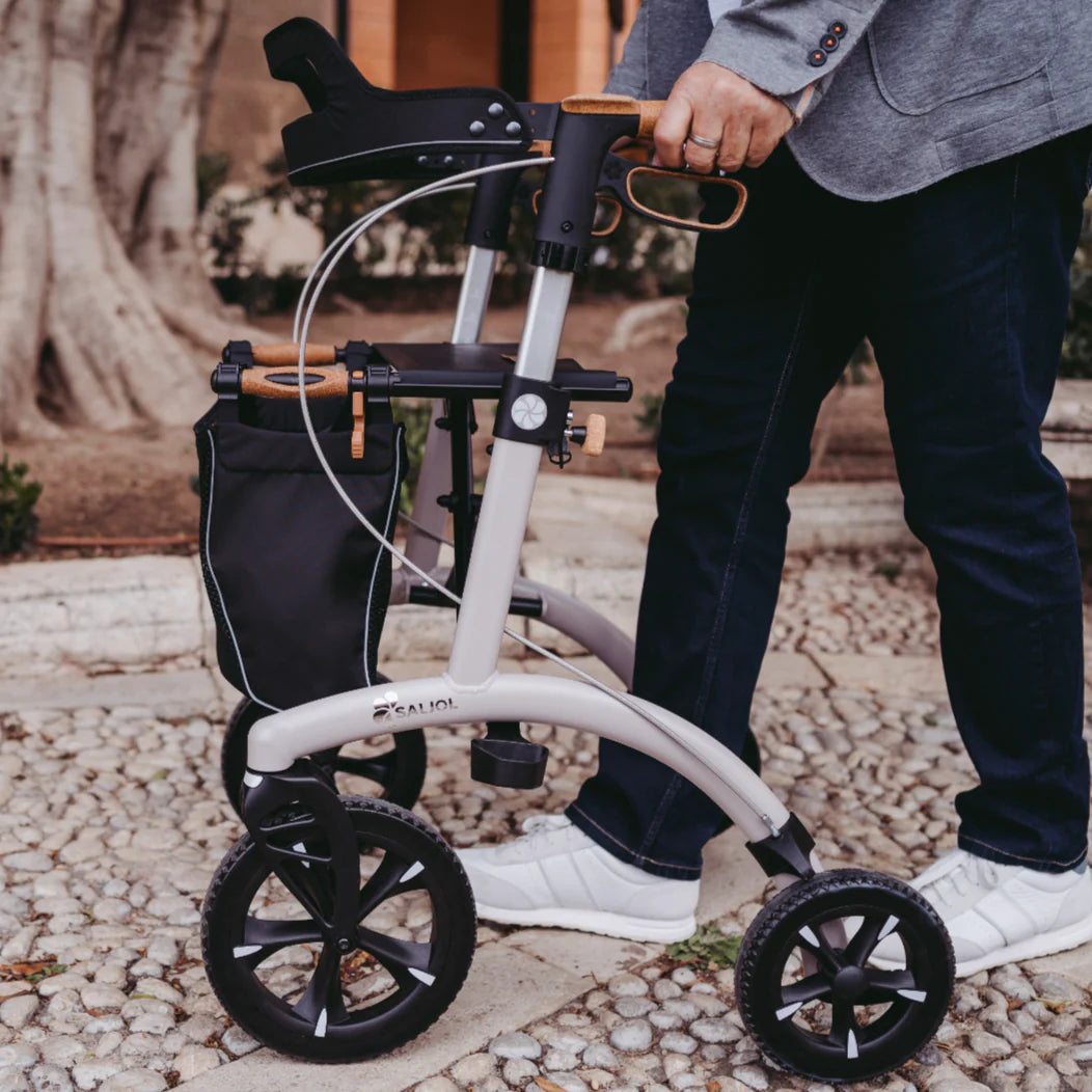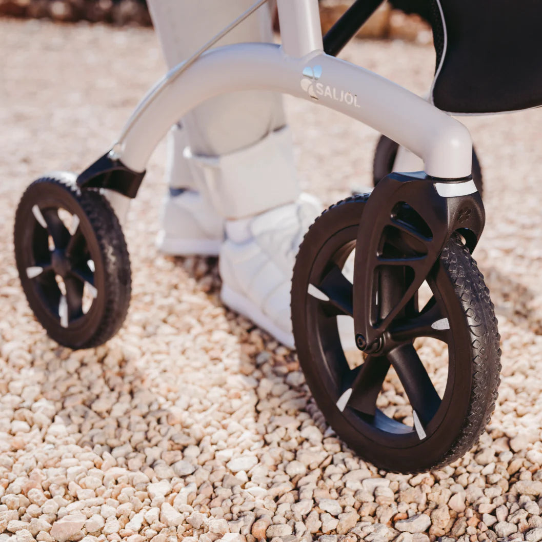 Saljol göngugrindin er með þægilegum og náttúrulegum kork handföngum, létt og lipur því auðveld í stjórnun með stórum hjólum sem gerir hana auðvelda til notkunar utandyra. Hún er útbúin endurskinsmerkjum og því vel sýnileg í myrkrinu á dimmum vetrar dögum. Saljol aluminium göngugrindin er alveg einstök fyrir þær sakir að hægt að breyta úr hefðbundinni tveggja handa bremsu í einnar handar bremsu sem bremsar á báðum hjólum á auðveldan hátt. Tilvalið fyrir einstaklinga sem eru t.d. með takmarkaðan styrk í annari hendi.