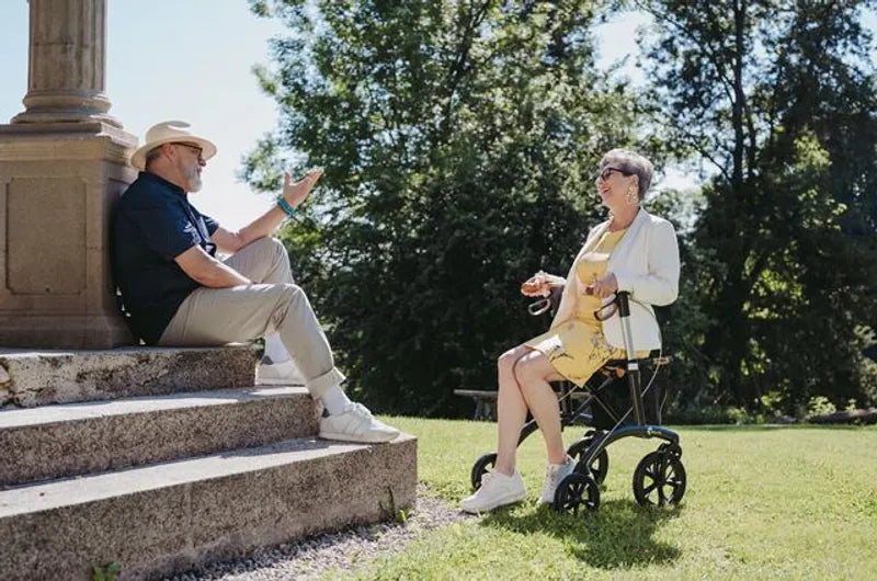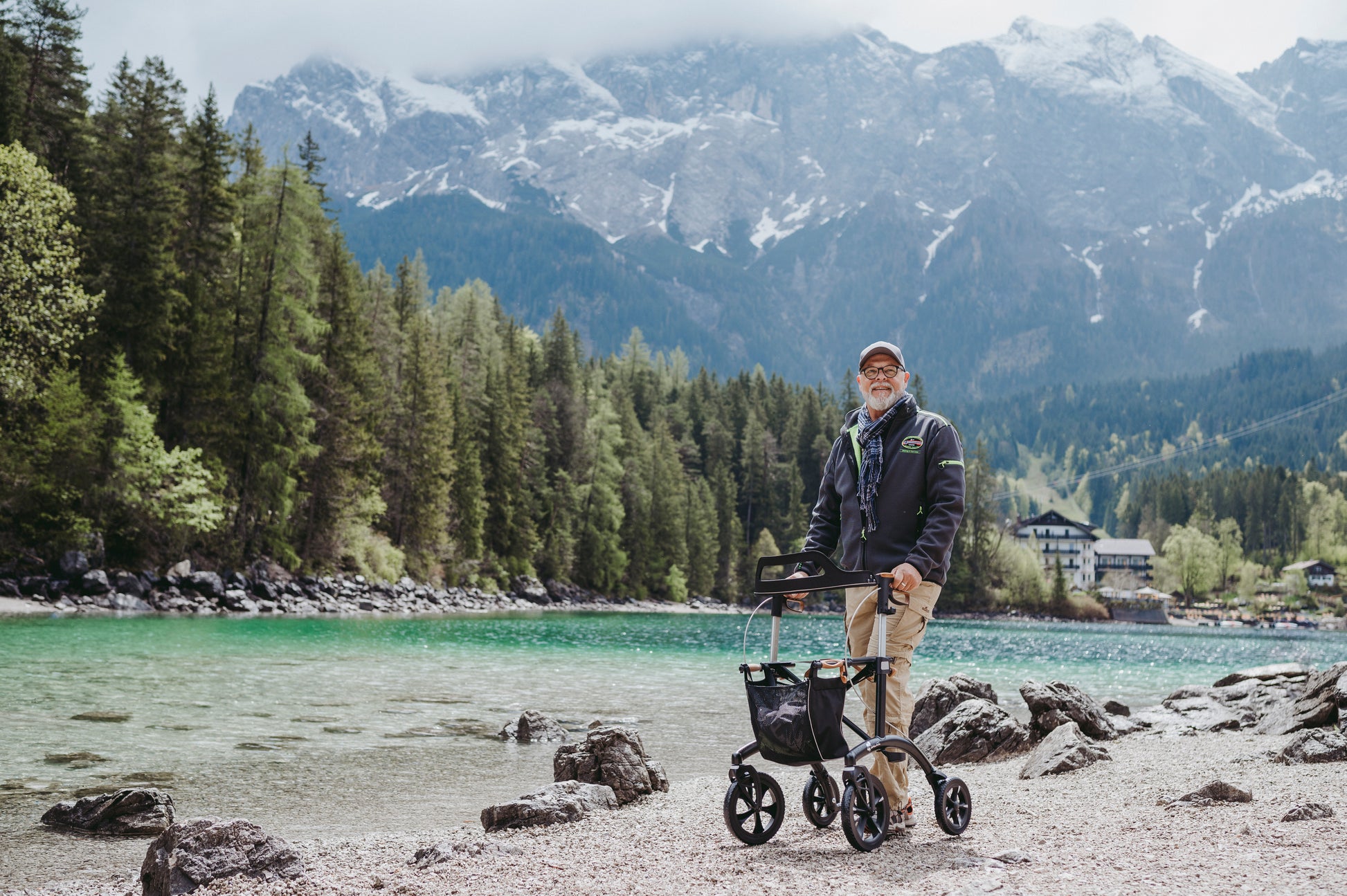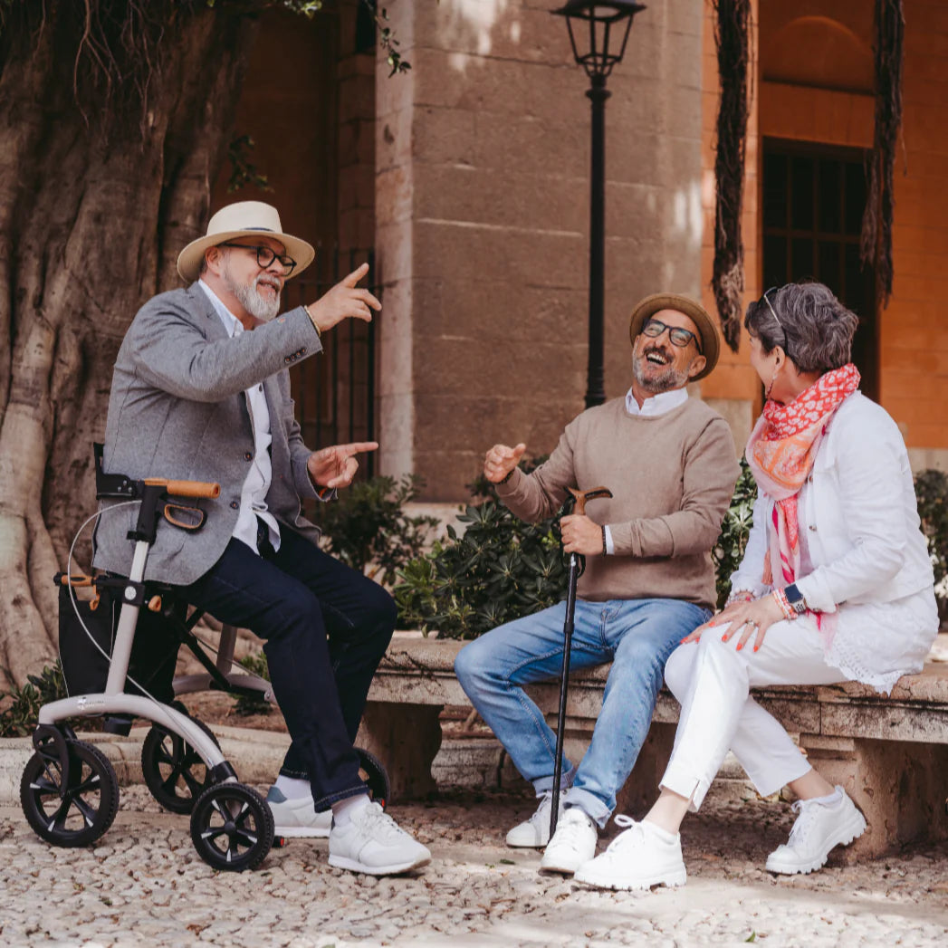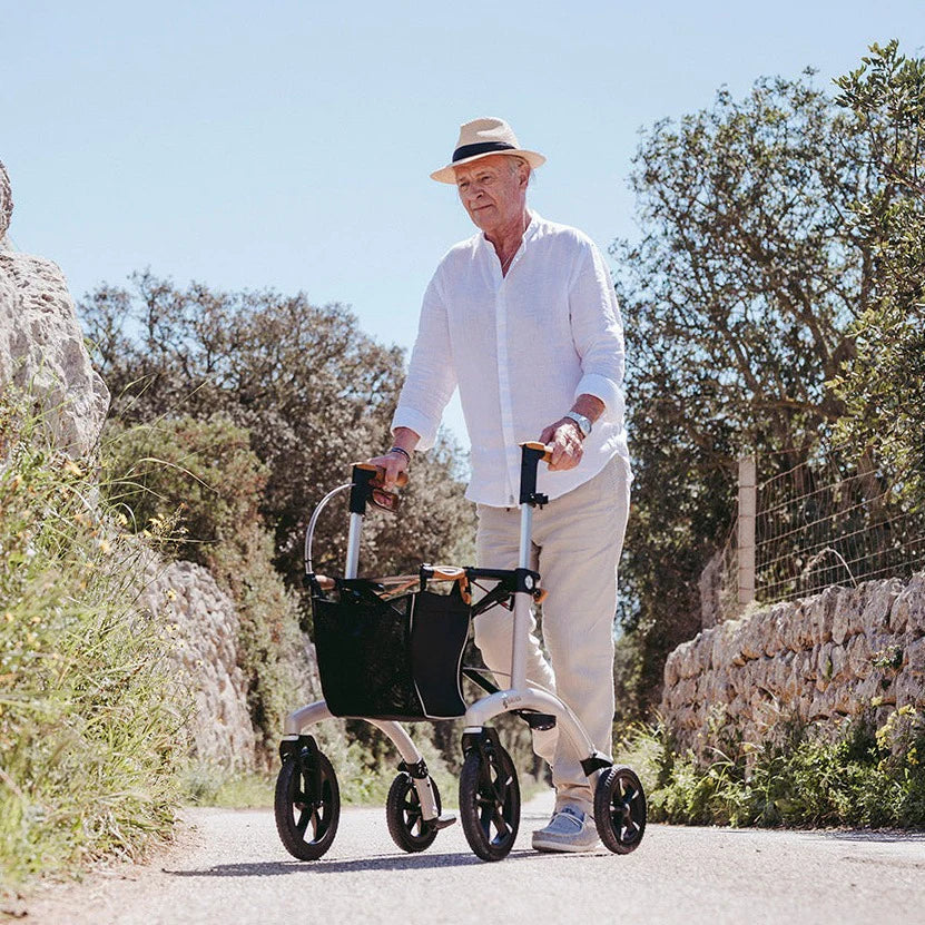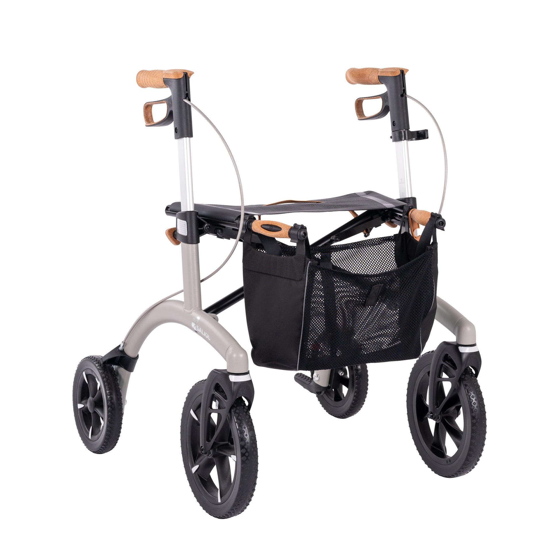 Saljol göngugrindin er með þægilegum og náttúrulegum kork handföngum, létt og lipur því auðveld í stjórnun með stórum hjólum sem gerir hana auðvelda til notkunar utandyra. Hún er útbúin endurskinsmerkjum og því vel sýnileg í myrkrinu á dimmum vetrar dögum. Saljol aluminium göngugrindin er alveg einstök fyrir þær sakir að hægt að breyta úr hefðbundinni tveggja handa bremsu í einnar handar bremsu sem bremsar á báðum hjólum á auðveldan hátt. Tilvalið fyrir einstaklinga sem eru t.d. með takmarkaðan styrk í annari hendi.
