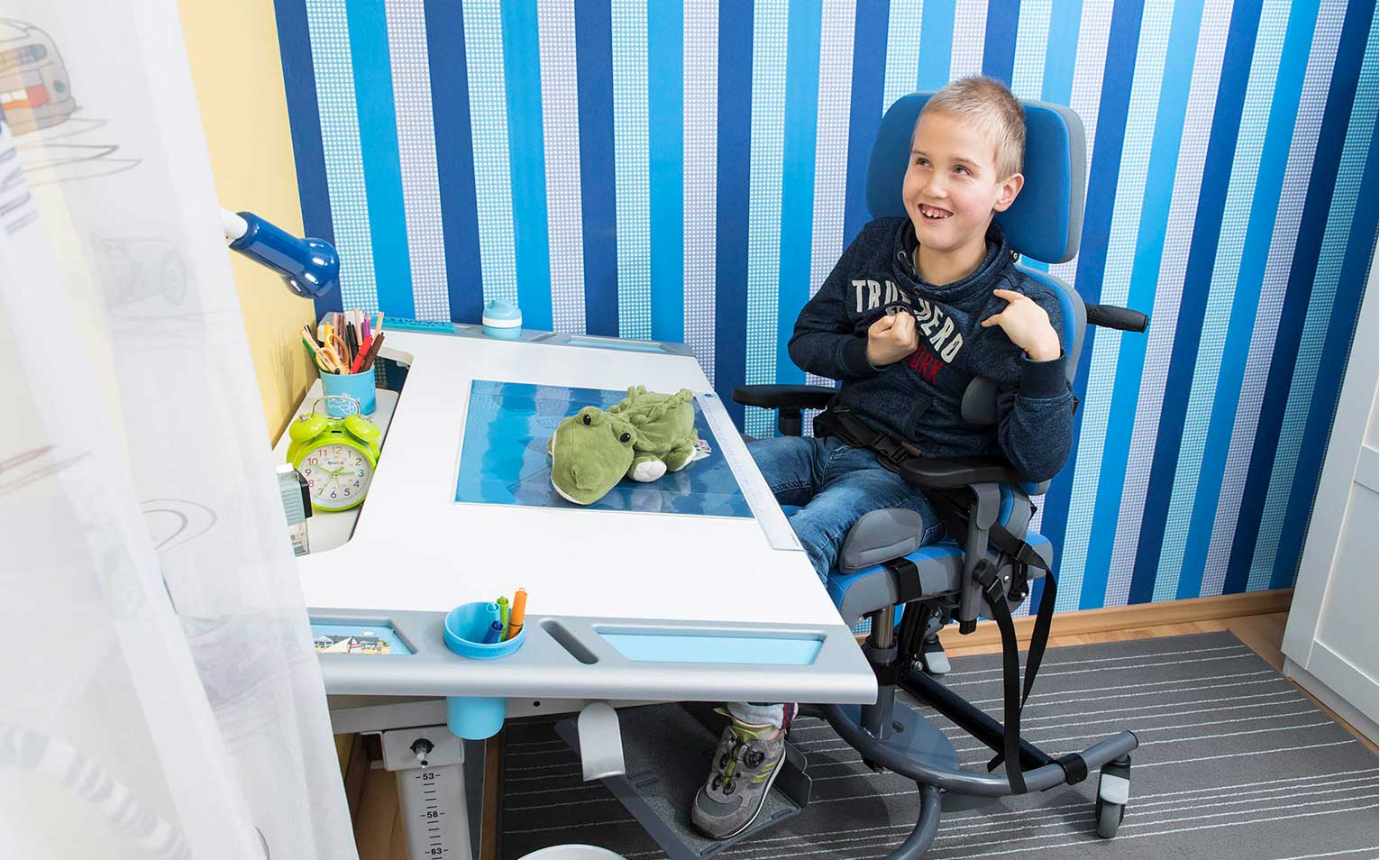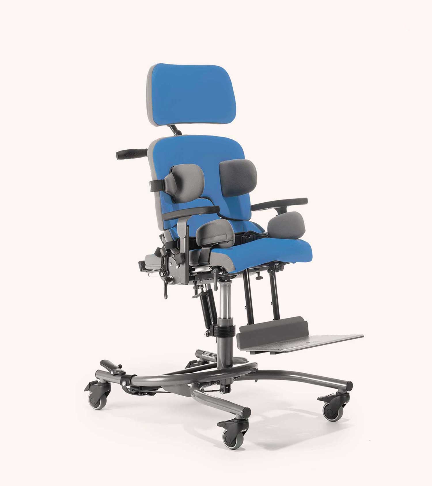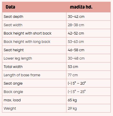 Madita HD er fjölhæfur og stillanlegur vinnustóll fyrir börn og ungmenni. Stóllinn gerir börnum kleift að sitja í augnhæð við jafnaldra sína. Madita HD (Heavy duty) er sérstaklega þróaður til að mæta sérstökum þörfum barna með mikla hreyfiútrás sem eiga það til að vagga eða spyrna sér aftur. Stóllinn er með Tilt-in-space og hæðarstillanlegur með aðstoð gaspumpu. Fjögur læsanleg færsluhjól. Rammi er með mótþyngd sem bætir stöðuleika stólsins og er hægt að fá í ýmsum þyngdum. Bak og fótplata er hæðar og hallastillanleg einnig eru armhvílur hæðar, halla og breiddar stillanlegar. Stólarnir eru afar vandaðir og framleiddir í Þýskalandi. Í boði er gott úrval af aukahlutum og sérlausnum og er því auðvelt að aðlaga stólinn að þörfum barnsins. Stílhreinn stóll sem fæst í mörgum litum.