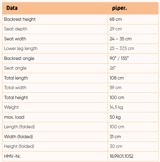 Piper er stílhrein og létt kerra með sérstökum stuðningi fyrir börn. Minnir á hefðbundna barnakerru en með ýmsum valmöguleikum í boði og betra burðarþol, eða 50kg. Hægt er að læsa öllum hjólum og fjarlæga fyrir flutning. Leggst vel saman. Bak er hallanlegt og fóðrað 5 punkta belti. Þessa kerru er hægt að nota inni og úti.