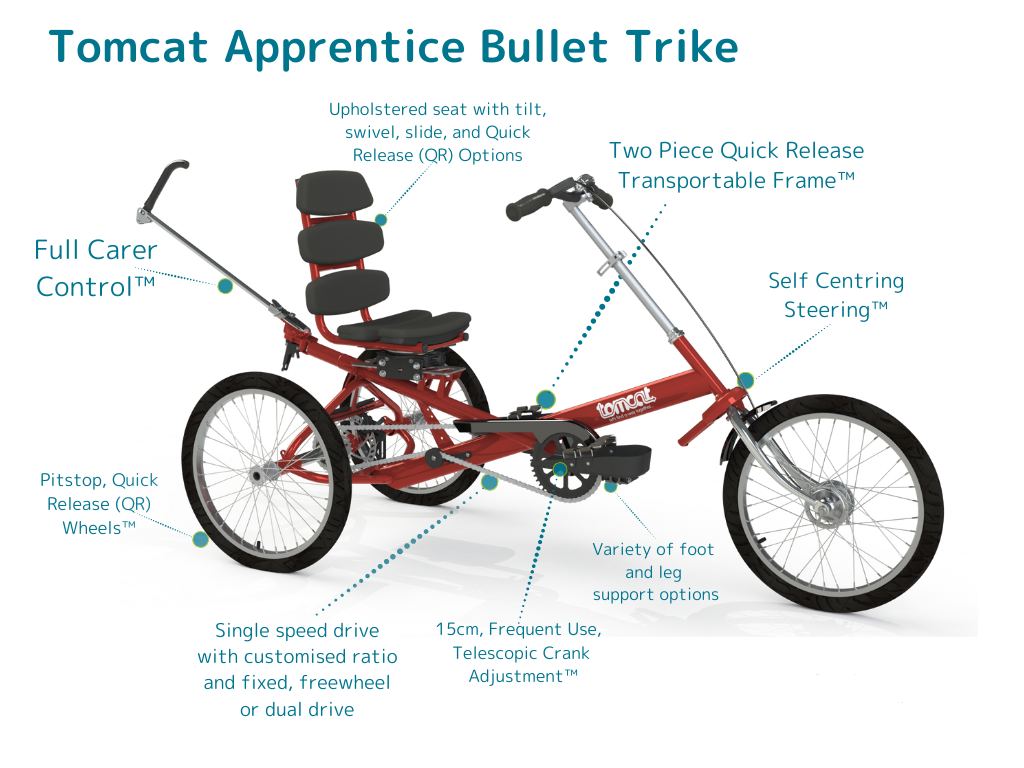 Tomcat Apprentice Bullet þríhjólið er hannað til að henta einstaklingum með ýmsar fatlanir og færniskerðingar sem og sjálfstæðari notendum. Hjólið er öruggt til notkunar utandyra, við ýmsar fjölskyldu athafnir og auðvelt í flutning.