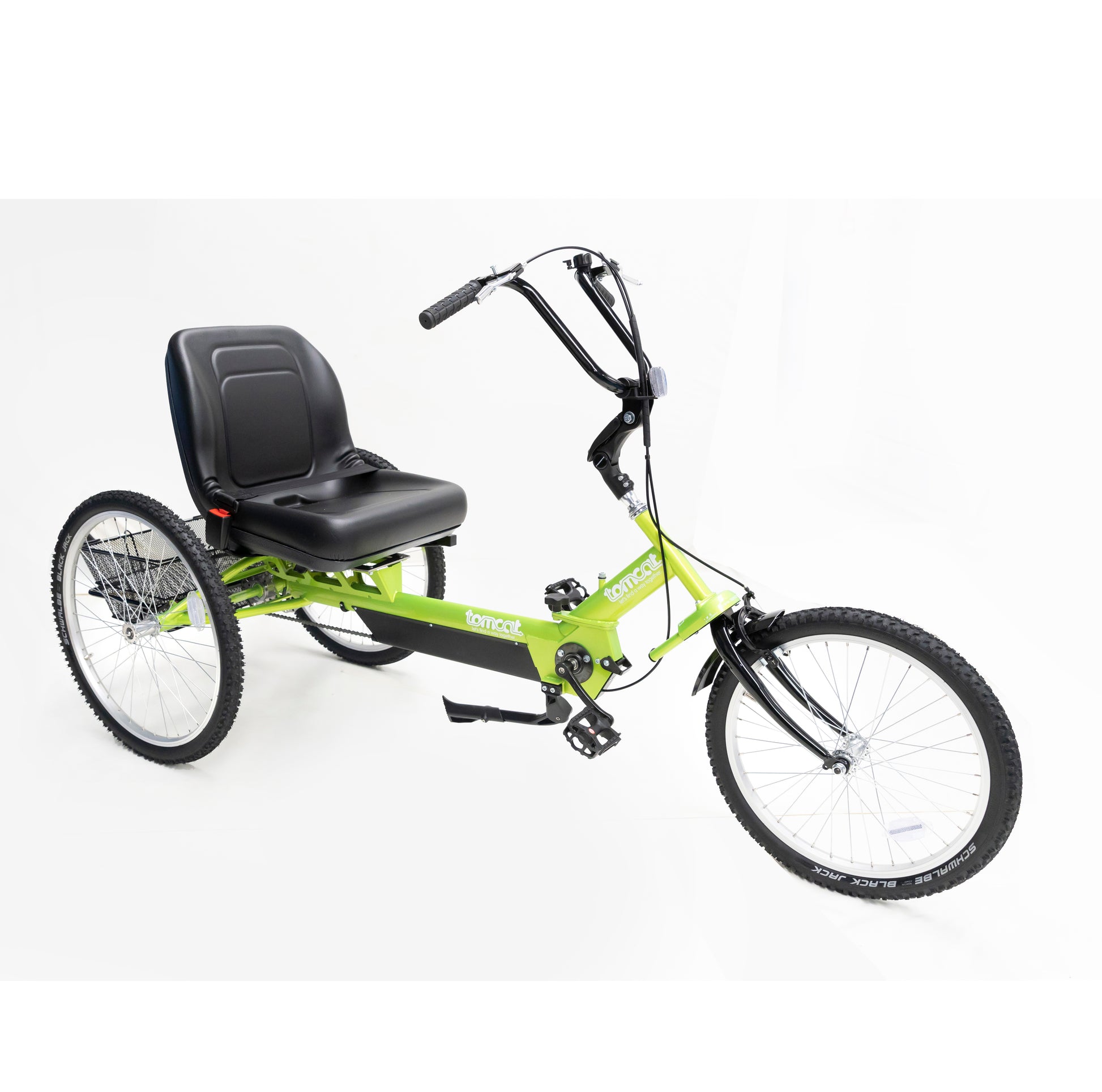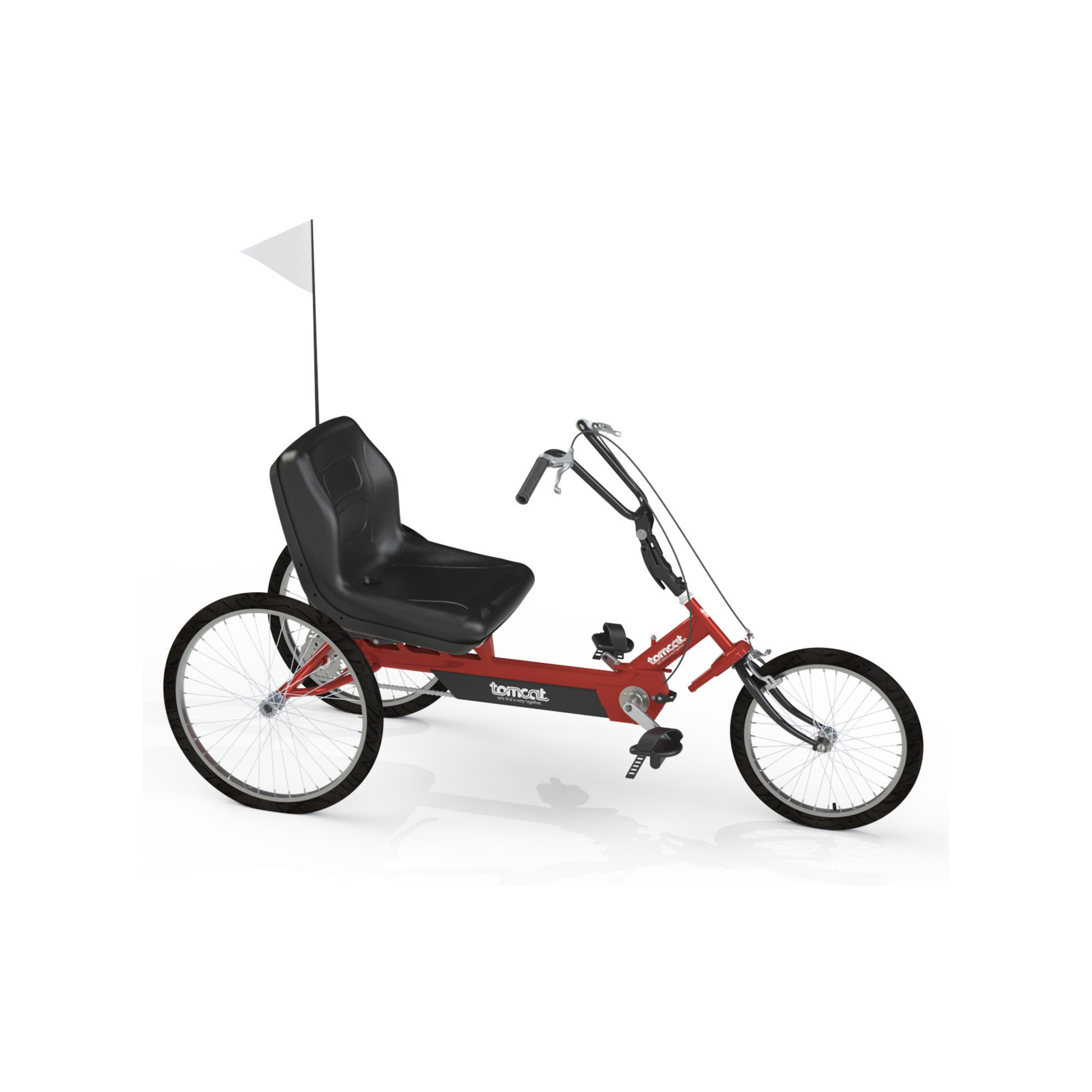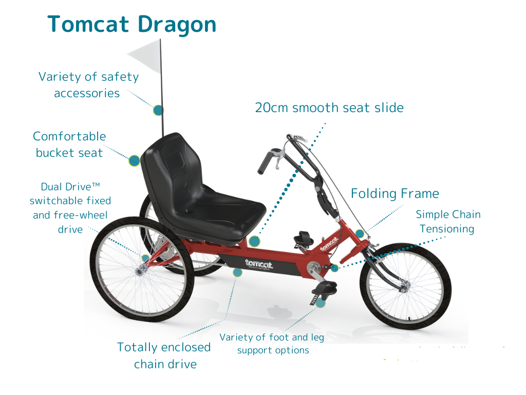 Tomcat Dragon er öruggt, stöðugt og notendavænt þríhjól fyrir sjálfstæða unglinga og fullorðna. Hannað sérstaklega sem fjölhæft og skemmtilegt hjól sem hentar fjölbreyttum notendahóp. Margar brautryðjandi nýjungar Tomcat gera það að verkum að Dragon er eitt af sterkbyggðustu, öruggustu og notendavænustu þríhjólum á markaðnum í dag. Keðjan er innbyggð í ramma hjólsins og kemur í veg fyrir algeng keðju vandamál. Auðvelt er að strekkja á keðju með keðju strekkjara á framhlið rammans. Sætið er á sleða sem gerir notendanum kleift að stilla sætið á einfaldan og nákvæman hátt. Þetta er mjög hentugt ef það er fleiri en einn notandi. Hjólið er mjög stöðugt vegna sjálfréttandi stýrisbúnaðar sem tryggir fullkomið jafnvægi og stjórn. Þetta tryggir einnig að stýrið á hjólinu réttir sig ávallt af þegar hjólið er í notkun. Diskabremsur að aftan tryggja öryggi og styttri hemlunarvegalengd.