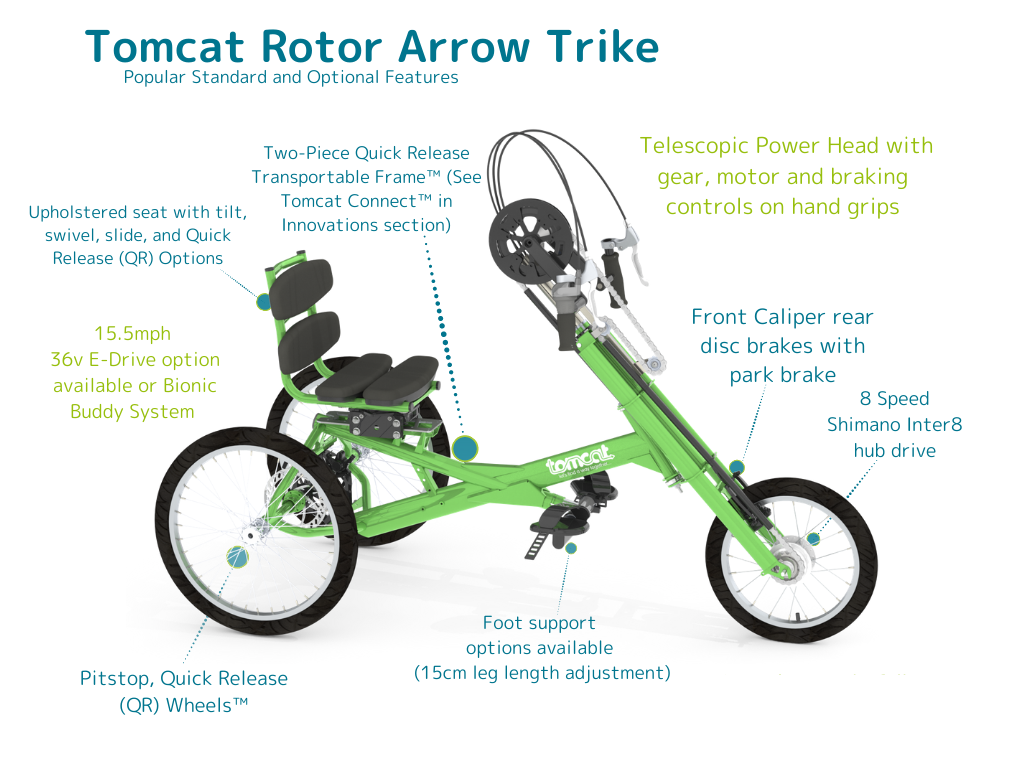 Rotor Arrow hjólið er létt, hægt að fá með tvískiptum ramma sem notast við "Make and Break™" sem er einstakt kerfi frá Tomcat til að taka ramman í sundur sem tengir saman gírastýringuna á stýrinu aftur þegar hjólið er sett saman á ný. Hjólið er því frábrugðið öðrum yfirleitt þyngri og fyrirferðameiri sérhæfðum þríhjólum. Hjólið getur verið tekið í sundur á örfáum sekúndum, þú tekur í hjólið í tvennt þrátt fyrir að hjólið sé með gírum. Tví skipti rammin leyfir hjólinu að vera auðveld í ferðalögum.