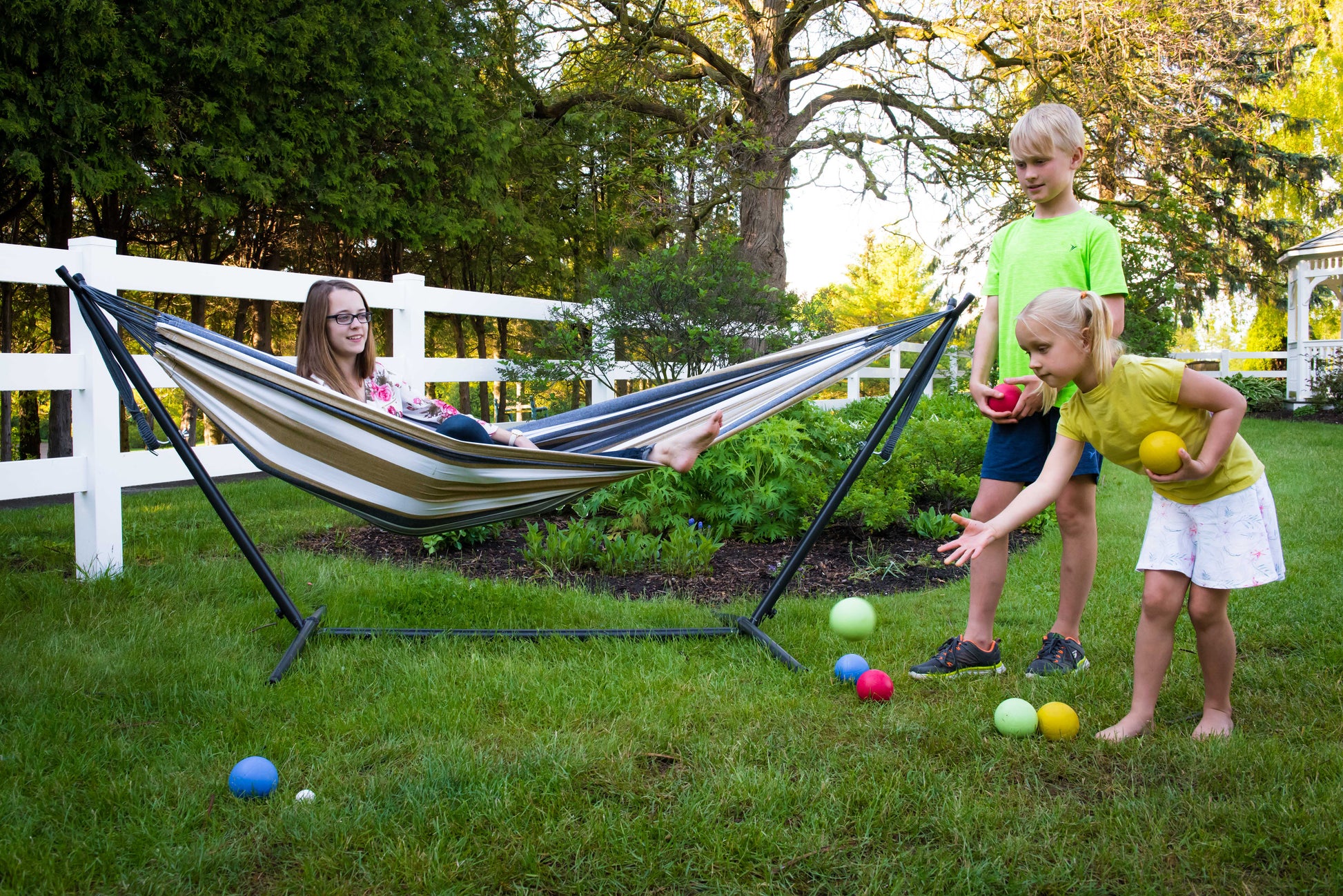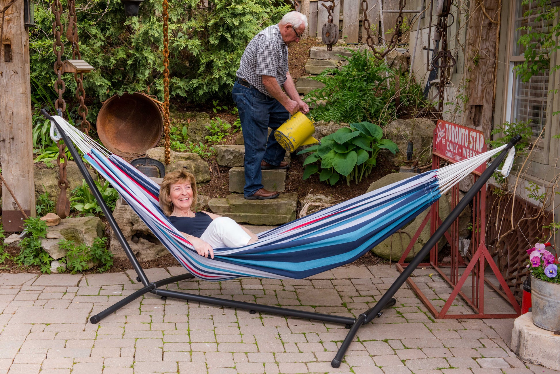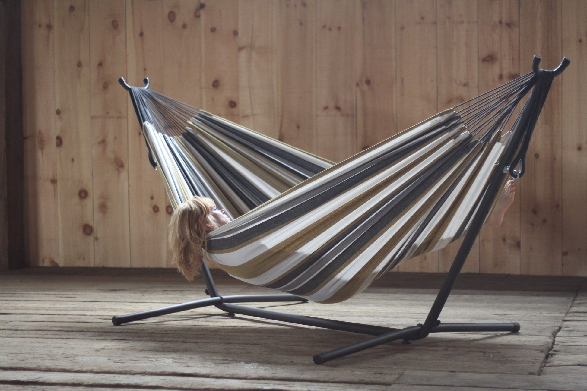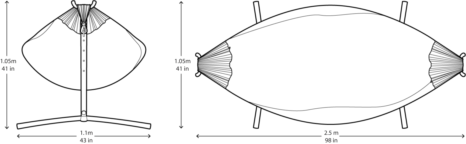 Vönduð tvöföld hengirúm með stand og tösku til að taka með í ferðalagið. Tilvalið fyrir alla, unga sem aldna! Eigðu góðar stundir með börnunum á góðviðrisdögum í garðinum, á ferðalaginu eða bara slappaðu af með góða bók við hönd á sólríkum sumardegi!
