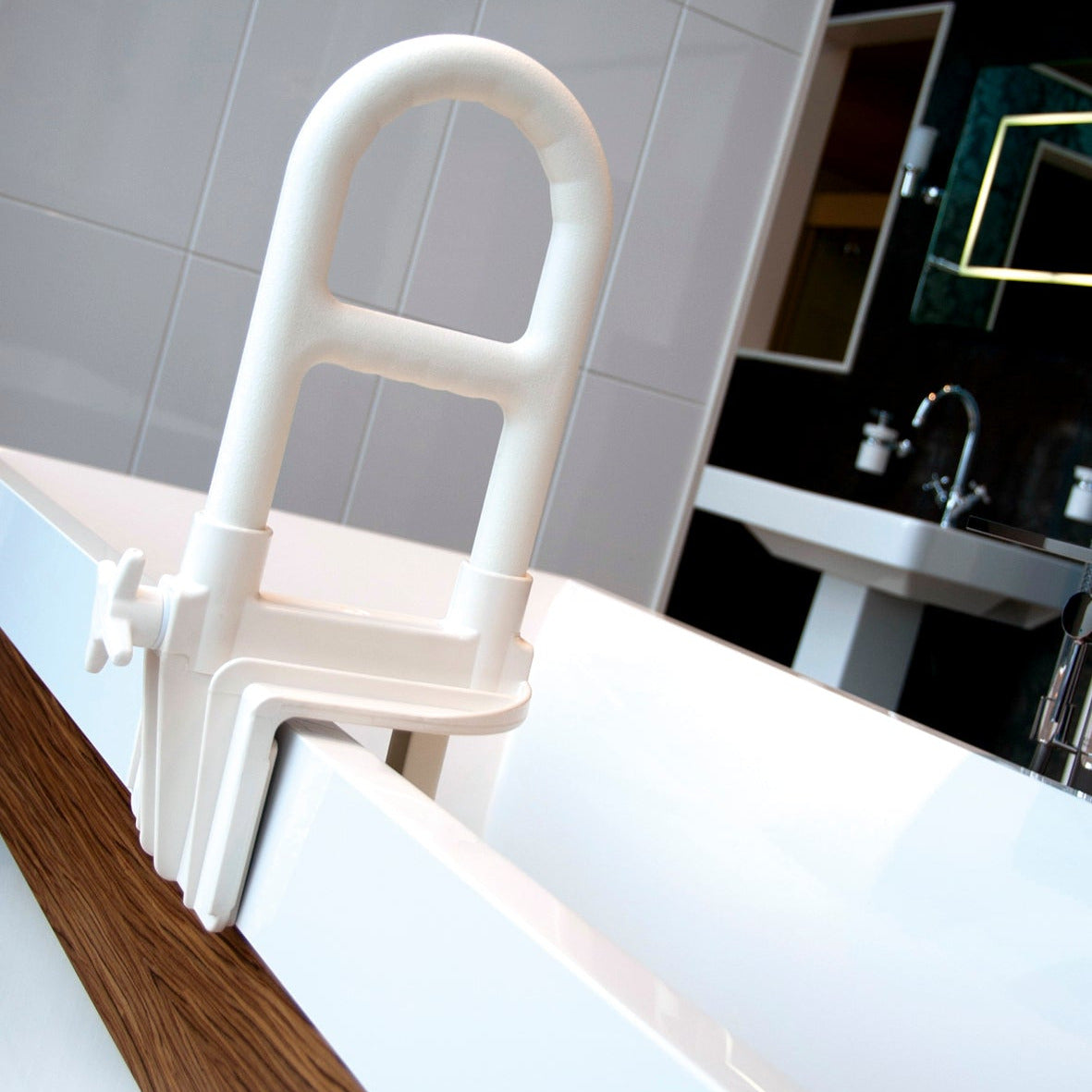 Hagnýt stuðningshandfang á baðkar. Bætir öryggi þegar farið er í og úr baði. Passar á flest baðkör þar sem hægt er að stilla op á festingu frá 6-11.5cm.