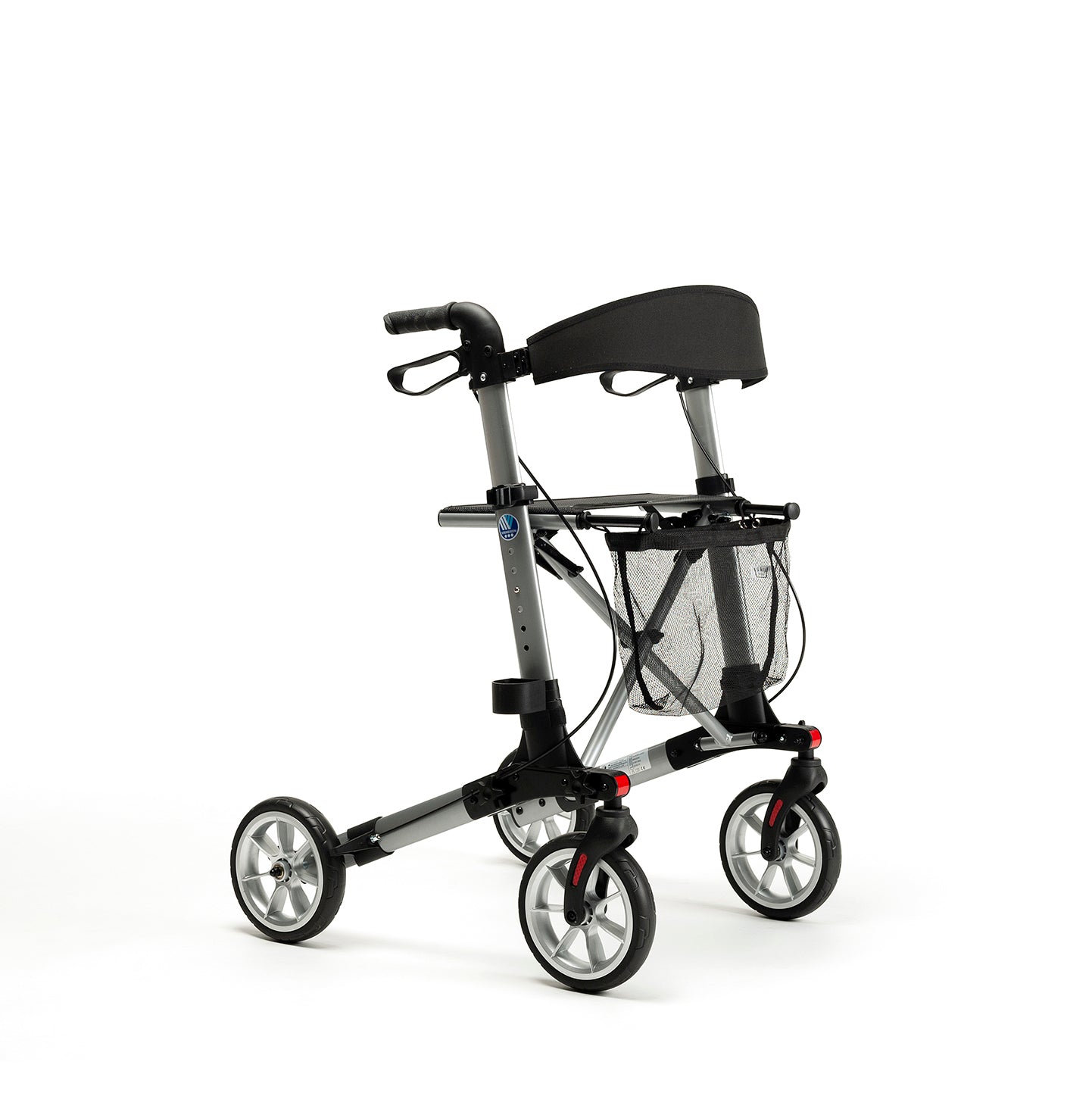 Þægileg létt ál göngugrind, stöðug og einföld í stillingum. Ergonómísk handföng hæðarstillanleg án verkfæra með handbremsu og stöðubremsu. Stendur uppi þegar hún er lögð saman. Hægt að fella afturhjóla arma og framhjól upp svo hún tekur minna pláss til flutnings og/eða geymslu. Kemur með stafa/hækju höldu, bakstuðning og taukörfu sem hægt er að taka af. Hámark þyngd í körfu 5 kg. Tvö ástig við aftari hjól.
