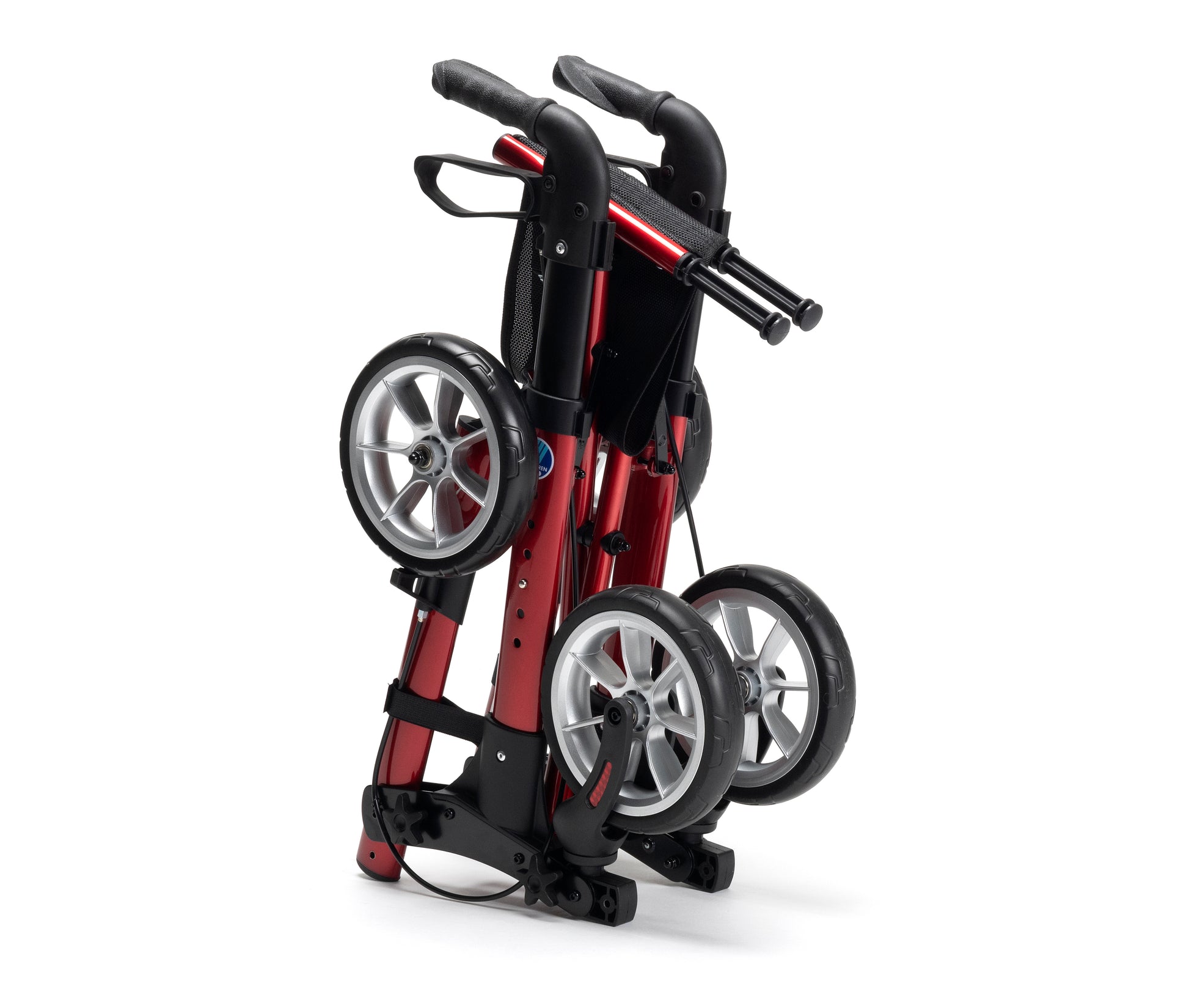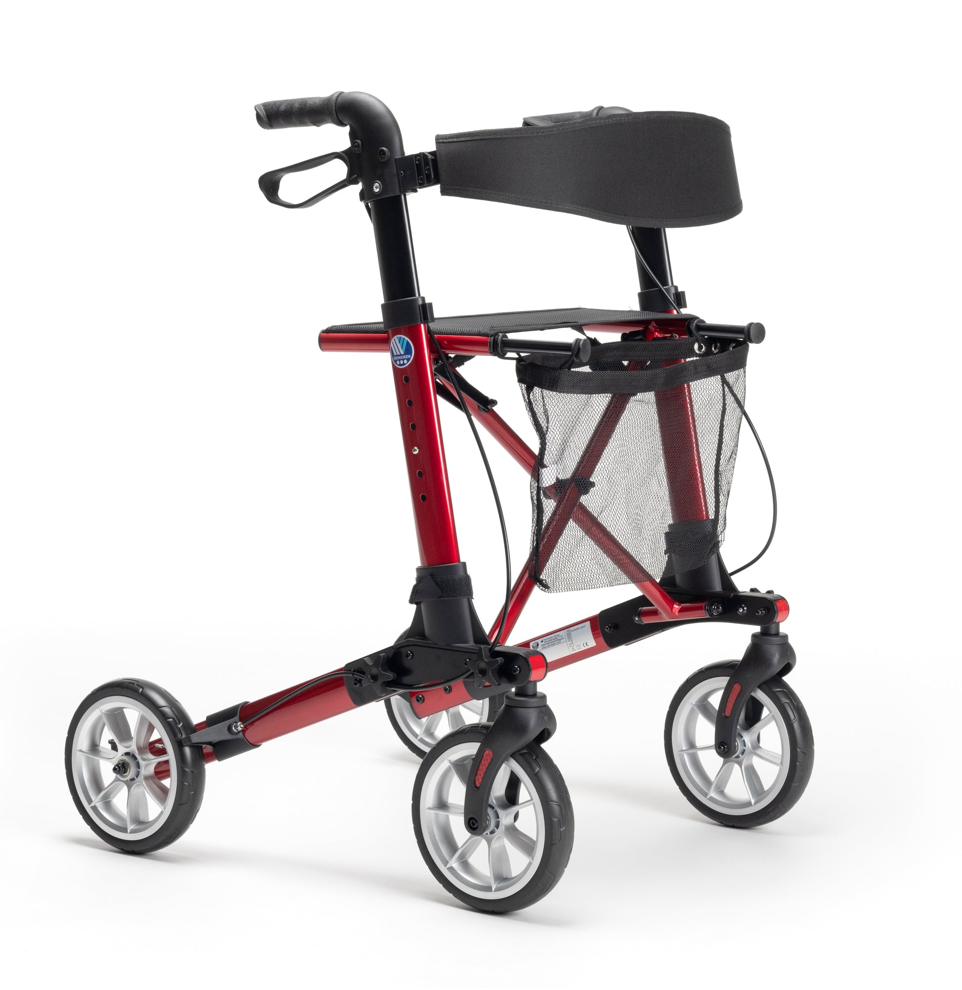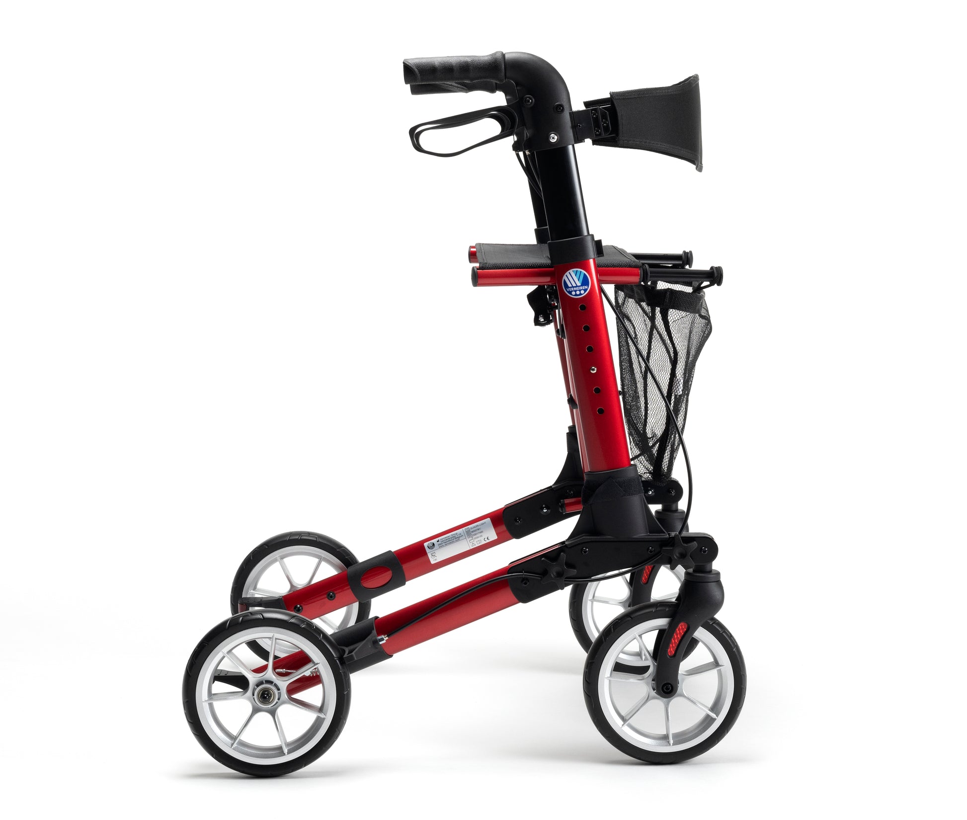 Þægileg létt ál göngugrind, stöðug og einföld í stillingum. Ergonómísk handföng hæðarstillanleg án verkfæra með handbremsu og stöðubremsu. Stendur uppi þegar hún er lögð saman. Hægt að fella afturhjóla arma og framhjól upp svo hún tekur minna pláss til flutnings og/eða geymslu. Kemur með stafa/hækju höldu, bakstuðning og taukörfu sem hægt er að taka af. Hámark þyngd í körfu 5 kg. Tvö ástig við aftari hjól.