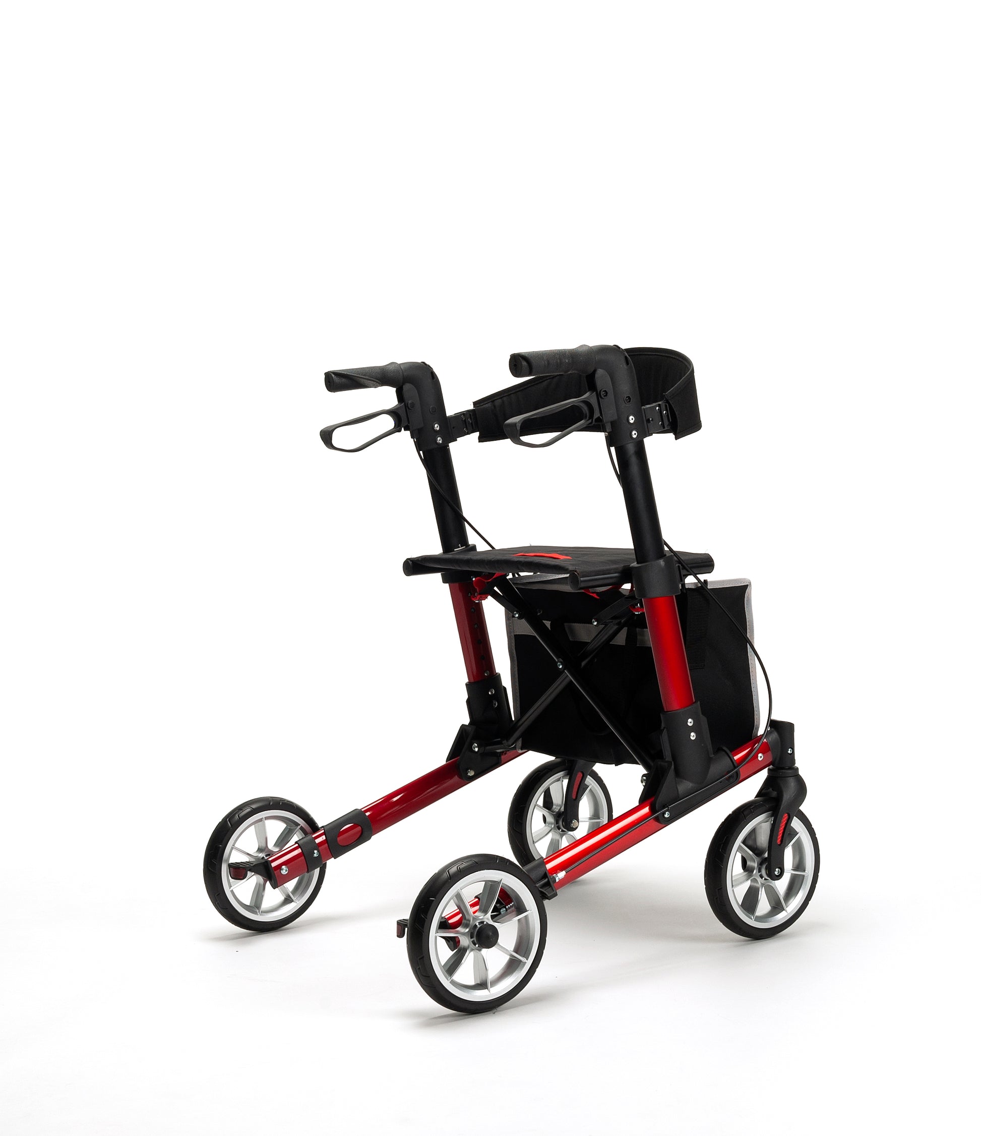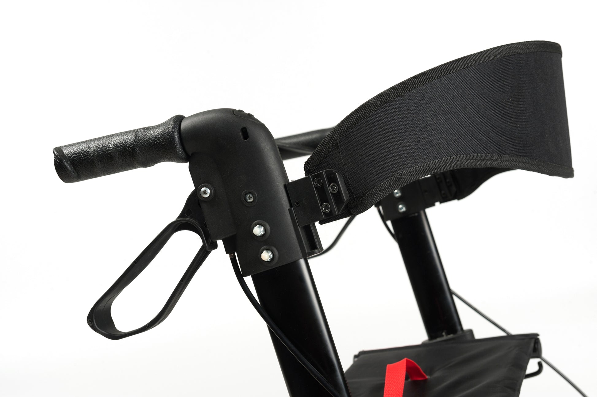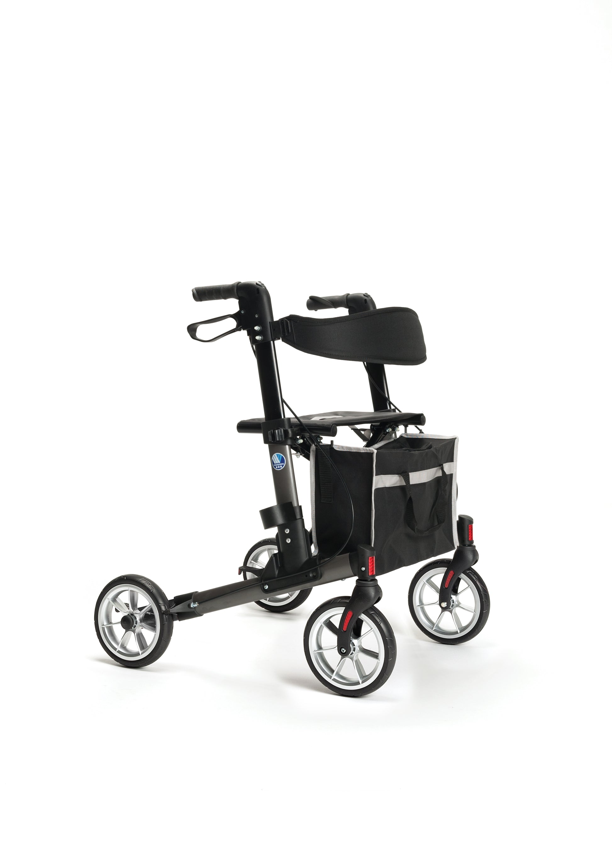 Einstaklega létt, stöðug og einföld í stillingum. Ergonómísk handföng hæðarstillanleg án verkfæra með handbremsu og stöðubremsu. Stendur uppi þegar hún er lögð saman. Hægt að fella ökuhandföng niður án verkfæra svo hún tekur minni pláss til flutnings og/eða geymslu. Kemur með stafa/hækju höldu, bakstuðning og tösku sem hægt er að taka af. Hámarks þyngd í körfu 5 kg. Tvö ástig við aftari hjól.